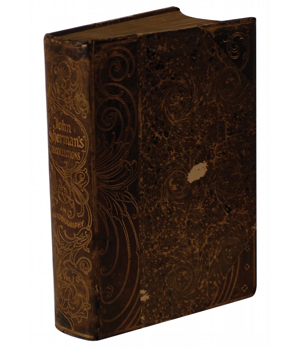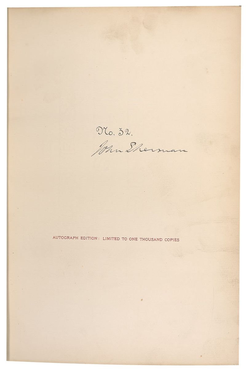 American politician, longtime United States Senator and author of the Sherman Anti-Trust Act. (1823–1900). Sherman also served as Secretary of the Treasury to President Hayes and Secretary of State to President McKinley. Signed book: John Sherman’s Recollections. First edition. Chicago: Werner Company, 1895. Hardcover, 7.25 x 10.5, 602 pages. Signed on the limitations page in fountain pen. Scattered light soiling to signed page, partially separated front joint, mild overall toning to inside pages, dampstaining to final pages, scattered wear and surface loss to covers and spine, wear to head and tail, and some mild rippling to back board from moisture exposure, otherwise very good condition.