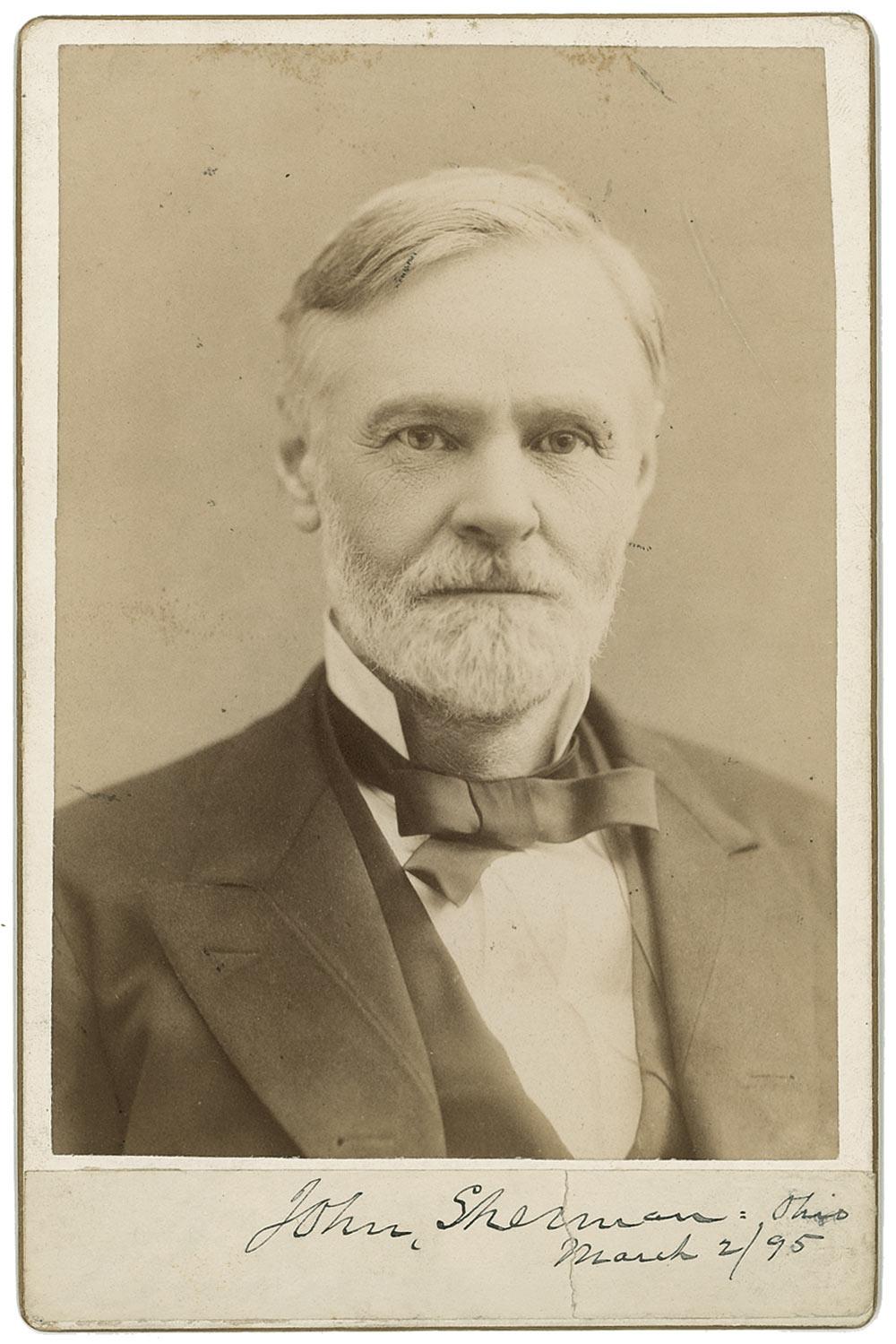 American politician, friend and supporter of Abraham Lincoln, and creator of the Sherman Anti-Trust Act. Excellent 4.25 x 6.5 cabinet portrait by Baker’s Art Gallery, Columbus, Ohio, showing the graying politician in suit and bow tie, signed in ink below the image on the mount, “John Sherman, Ohio, March 2/95.” In fine condition, with a few trivial surface marks and a short vertical crack passing through Sherman’s surname and date. Provenance: The Barry Hoffman Collection.