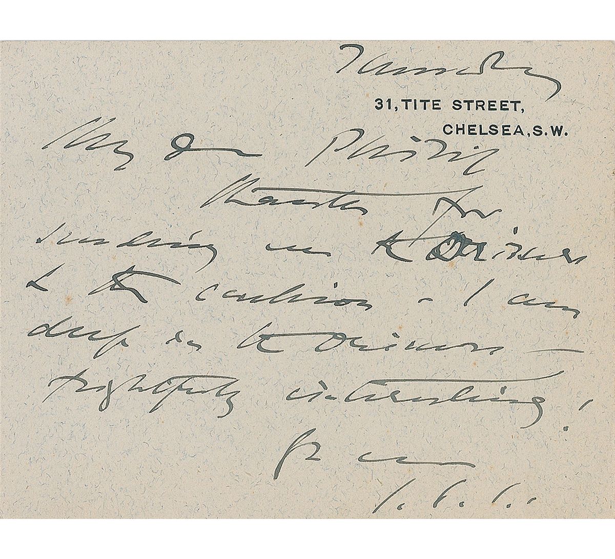ALS signed “J. S. S.,” one page on a 4.5 x 3.5 personal correspondence card, no date. Letter to Sir Philip Sassoon. In full: “Thanks for sending me the sitters & the cushion. I am deep in the Oeuvres—frightfully interesting.” In fine condition. Sassoon was a prominent art collector and served as chairman of the trustees of the National Gallery in London.