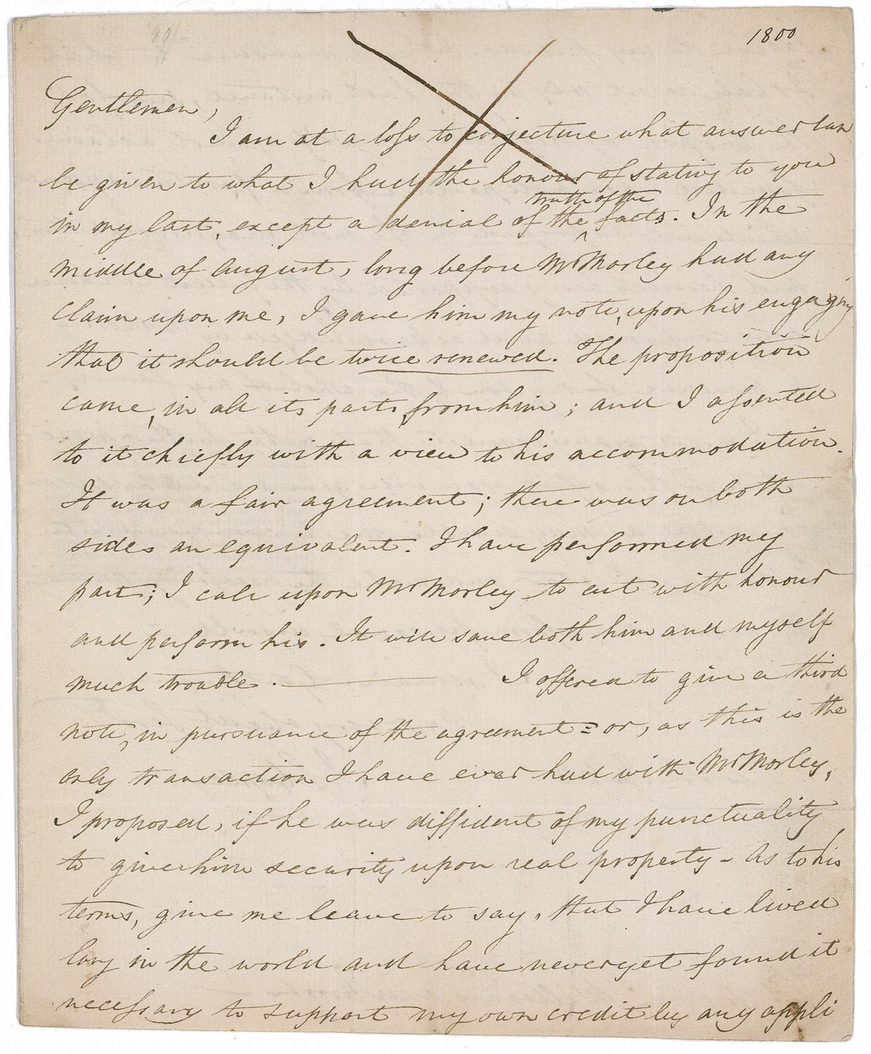 I offered to give a third note, in pursuance of the agreement or, as this is the only transaction I have ever had with Mr. Morley, I proposed if he was dissident of my punctuality to give him security upon real property—as to his terms, give me leave to say, that I have lived long in the world and have never yet found it necessary to support my own credit by any application to my friends. It is a measure to which I shall resort only in the last instance, much for the purpose of defending myself against a claim founded upon a departure from a positive agreement which was expressed in the most unequivocal terms and besides being supported by the fullest evidence was confirmed and acknowledged by Mr. Morley in presence of my son and the whole of my family. I must again request that in the further prosecution of this affair you will give me such reasonable notice as may enable me to communicate with my solicitor and make the necessary provisions to secure me from personal insult.” The second integral page bears an address panel written in another hand. In very good condition, with intersecting folds (several extra vertical folds), one through a single letter of signature, scattered wrinkling, mild toning and soiling, ink “X” through first few lines of text, and a few tape repairs to integral second page. The writing is dark and clear throughout, and much of the black wax seal remains.