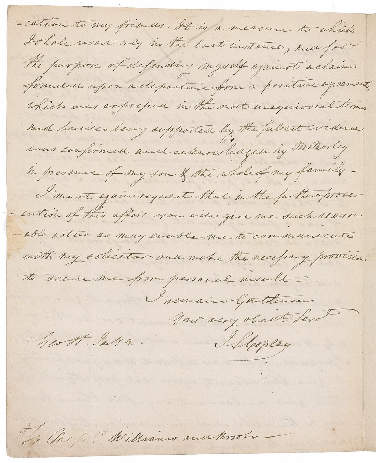 Rare ALS signed “J. S. Copley,” one page both sides, 7.5 x 9.25, mailing panel postmarked January 2, 1800. Copley writes to Messrs. Williams and Brooks. In part: “Gentlemen, I am at a loss to conjecture what answer I am to be given to what I had the honour of stating to you in my last, except a denial of the matter of facts. In the middle of August, long before Mr. Morley had any claim upon me, I gave him my note, upon his…that it should be twice renewed. The proposition came in all its parts from him; and I…to it chiefly with a view to his accommodation. It was a fair agreement there was on both sides an equivalent. I have performed my part; I call upon Mr. Morley to cut with honour and perform his. It will save both him and myself much trouble.