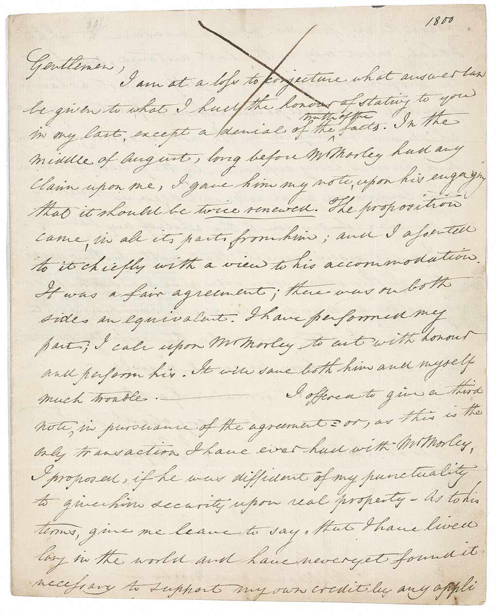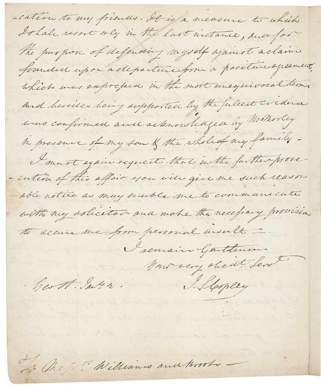 American-born painter (1738–1815) best known for his distinctive portraits of patriots such as Paul Revere and of upper-class Boston society. After emigrating to England, he took up large-scale historical scenes, including one of his most famous works, the dramatic maritime tableau Watson and the Shark. Rare ALS signed “J. S. Copley,” one page both sides, 7.5 x 9.25, mailing panel postmarked January 2, 1800. Copley writes to Messrs. Williams and Brooks. In part: “Gentlemen, I am at a loss to conjecture what answer I am to be given to what I had the honour of stating to you in my last, except a denial of the matter of facts. In the middle of August, long before Mr. Morley had any claim upon me, I gave him my note, upon his…that it should be twice renewed. The proposition came in all its parts from him; and I…to it chiefly with a view to his accommodation. It was a fair agreement there was on both sides an equivalent. I have performed my part; I call upon Mr. Morley to cut with honour and perform his. It will save both him and myself much trouble. I offered to give a third note, in pursuance of the agreement or, as this is the only transaction I have ever had with Mr. Morley, I proposed if he was dissident of my punctuality to give him security upon real property—as to his terms, give me leave to say, that I have lived long in the world and have never yet found it necessary to support my own credit by any application to my friends. It is a measure to which I shall resort only in the last instance, much for the purpose of defending myself against a claim founded upon a departure from a positive agreement which was expressed in the most unequivocal terms and besides being supported by the fullest evidence was confirmed and acknowledged by Mr. Morley in presence of my son and the whole of my family. I must again request that in the further prosecution of this affair you will give me such reasonable notice as may enable me to communicate with my solicitor and make the necessary provisions to secure me from personal insult….” The adjacent leaf bears the mailing panel written in another hand. In very good condition, with intersecting folds, scattered wrinkling, mild toning and soiling, ink “X” though first few lines of text, and a few tape repairs to integral second page. The writing is dark and clear throughout.