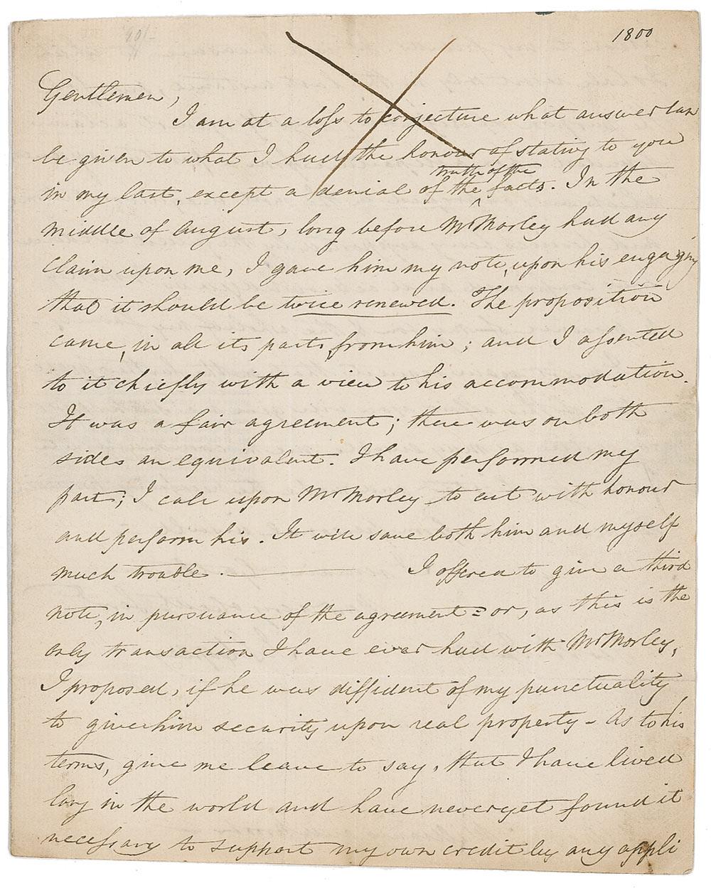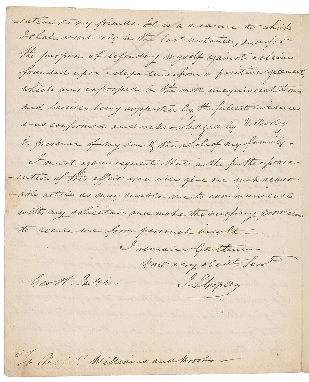 American-born painter (1738–1815) best known for his distinctive portraits of patriots such as Paul Revere and of upper-class Boston society. After emigrating to England, he took up large-scale historical scenes, including one of his most famous works, the dramatic maritime tableau Watson and the Shark. Rare ALS signed “J. S. Copley,” one page both sides, 7.5 x 9.25, mailing panel postmarked January 2, 1800. Copley writes to Messrs. Williams and Brooks. In part: “Gentlemen, I am at a loss to conjecture what answer I am to be given to what I had the honour of stating to you in my last, except a denial of the matter of facts. In the middle of August, long before Mr. Morley had any claim upon me, I gave him my note, upon his…that it should be twice renewed. The proposition came in all its parts from him; and I…to it chiefly with a view to his accommodation. It was a fair agreement there was on both sides an equivalent. I have performed my part; I call upon Mr. Morley to cut with honour and perform his. It will save both him and myself much trouble. I offered to give a third note, in pursuance of the agreement or, as this is the only transaction I have ever had with Mr. Morley, I proposed if he was dissident of my punctuality to give him security upon real property—as to his terms, give me leave to say, that I have lived long in the world and have never yet found it necessary to support my own credit by any application to my friends. A rare offering from the first genius of American painting. It is a measure to which I shall resort only in the last instance, much for the purpose of defending myself against a claim founded upon a departure from a positive agreement which was expressed in the most unequivocal terms and besides being supported by the fullest evidence was confirmed and acknowledged by Mr. Morley in presence of my son and the whole of my family. I must again request that in the further prosecution of this affair you will give me such reasonable notice as may enable me to communicate with my solicitor and make the necessary provisions to secure me from personal insult.” The second integral page bears an address panel written in another hand. In very good condition, with intersecting folds (several extra vertical folds), one through a single letter of signature, scattered wrinkling, mild toning and soiling, ink “X” though first few lines of text, and a few tape repairs to integral second page. The writing is dark and clear throughout, and much of the black wax seal remains.