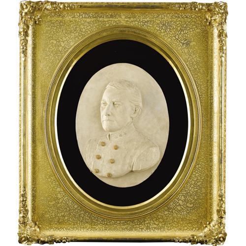 <B>John Singleton Mosby, A Plaster Bust by Herbert Barbee</B></I> John Singleton Mosby (1833-1916) was a Confederate cavalryman famous for his raiding behind enemy lines with his 'Partisan Rangers'. He is generally given credit for prolonging the life of the Confederacy, ruling in military superiority in eastern Virginia so much that the area became known as 'Mosby's Confederacy'.<BR> This magnificent plaster bust of Colonel Mosby was completed by the master sculptor Herbert Barbee in 1920. Done in a bass-relief oval at 1" in depth and signed 'Herbert Barbee, 1920' under Mosby's left arm, the piece measures 18 1/2" x 24 1/2" and is in excellent condition. Mosby is depicted facing to his right in a serene pose dressed in his Confederate Colonel's uniform with the corresponding three stars at the collar. His highly-detailed Virginia frock coat buttons have been hand-gilded, the intricate lines of his facial features and hair well-defined, all giving the sense that this portrait could have been done from life, even though it was completed four years after his death as a commemoration of the great cavalry officer's life.<BR> Herbert Barbee studied his craft in Italy and completed many pieces in the United States, but none as spectacular as this. He has captured the essence of Mosby and his stately demeanor. Fabulously framed in a a 5" highly-carved wooden frame with a beaded oval 26" opening, this portrait bust of Mosby is one of a kind.<BR><BR> <B>Provenance:</B></I> <I>The Tharpe Collection of American Military History</B></I><BR> <BR><B>Exhibited:</B></I> <I>The Liberty Heritage Society Museum</B></I><BR><BR><b>Shipping:</b> Requires 3rd Party Shipping (<a target="_blank" href="http://www.heritageauctions.com/common/shipping.php">view shipping information</a>)