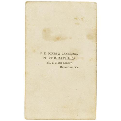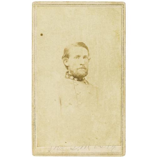 <B>John Singleton Mosby Signed <I>Carte de Visite</B></I></B></I> - Clearly signed <I>Jno S. Mosby</B></I>in pencil along lower margin, C. E. Jones & Vannerson, Richmond, Virginia Confederate backmark. This image would have been taken early in 1865 following Mosby's recovery from the December 21, 1864 wound that nearly killed him. His collar displays the three stars of a full Confederate colonel. Light stains on the back, some wear. Very good condition and very rare signed war-dated autograph.<BR><BR><B>Provenance:</B></I> <I>The Tharpe Collection of American Military History</B></I><BR><BR><B>Exhibited:</B></I> <I>The Liberty Heritage Society Museum</B></I><BR><BR><b>Shipping:</b> Flat Material, Small (<a target="_blank" href="http://www.heritageauctions.com/common/shipping.php">view shipping information</a>)