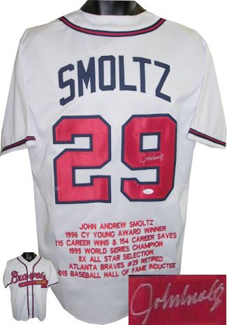 John Smoltz is best known for his prolific career of more than two decades with the Atlanta Braves, in which he garnered eight All-Star selections and received the Cy Young Award in 1996. Though predominantly known as a starting pitcher, Smoltz was converted to a reliever in 2001, following his recovery from Tommy John surgery, and spent four years as the team's closer before returning to a starting role. In 2002 he became only the second pitcher in history to have had both a 20-win season and a 50-save season (the other being Hall of Famer Dennis Eckersley). He is the only pitcher in major league history to top both 200 wins and 150 saves. He became the 16th member of the 3,000 strikeout club on April 22, 2008. John Smoltz Atlanta Braves has hand autographed this unlicensed custom-prostyle White jersey with twill stitched nameplate and numbers with embroidered stats. JSA Hologram and Certificate of Authenticity.