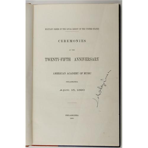 <B>John Philip Sousa Signed Book</B></I> From the legendary conductor "The March King," here is a program from the ceremonies at the 25th anniversary of the Military Order of the Loyal Legion of the United States, held at the Academy of Music in Philadelphia, PA, April 15th, 1890. 8vo, multicolored silver & gold embossed boards, color lithographed frontis., 78 pages. The U.S. Marine Band, of which Sousa was the Director at this time, performed Sousa's "Loyal Legion March" at this event, along with several additional pieces. Signed crisply by John Philip Sousa in blue-black ink on the title page. Very attractive, binding is Very Good, interior is bright and very attractive with slight foxing to one interior page only.