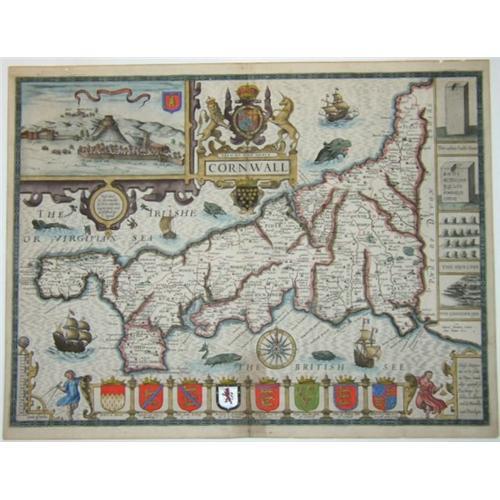Coloured; light age-toning This is one of the most famous and decorative of all English county maps, with an inset view of Launceston, coats of arms, ships, sea-monsters, various local antiquities. Drawn from information provided by John Norden and engraved by Jodocus Hondius. From Speed's atlas 'The Theatre of the Empire of Great Britaine'.