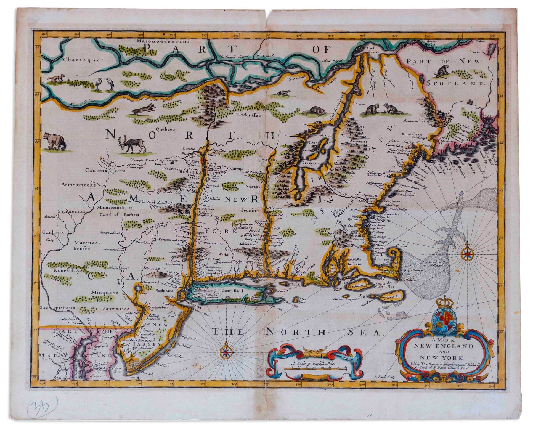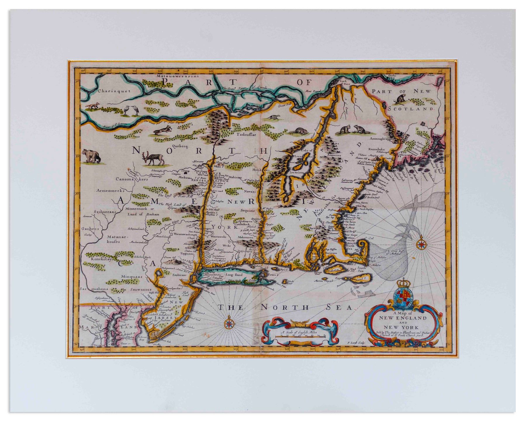 The most famous 17th century map of New England, engraved by cartographer Francis Lamb with Anglican names for the first time reflecting the shift from Dutch to English rule, such as New York rather than New Amsterdam and ''New Jarsey''. London: Basset and Chisswell, 1676, from the reissue of John Speed's atlas, ''The Theatre of the Empire of Great Britaine'', with new maps of the English colonies. Colorful double-page map entitled ''A Map of New England and New York'', shows wildlife of the area in addition to topography and boundary lines. With English text on verso headlined, ''The Description of New Neatherlands [sic] now called NEW-YORK'' and ''The Description of New England''. Engraved map measures 21'' x 17.125'', hinged at top to mat measuring 26.375'' x 21.375''. Slight offset along center fold, tape repair to verso, small separation at top center fold, and minute foxing. Overall very good plus condition.