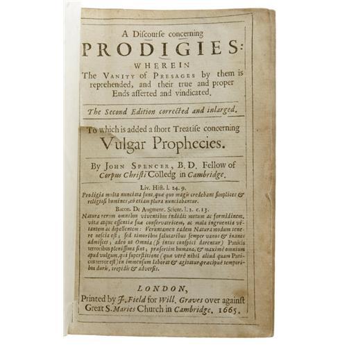 <B>John Spencer: <I>A Discourse Concerning Prodigies</B></I></B></I> (London: J. Field, 1665), two parts in one volume. Small 8vo, full contemporary calf, front board detached. Title page torn, with Vatican stamp on verso. An important work which attacked so-called prophets & soothsayers which abounded in England at that time, only one year before the deadly 1666 London fire & plague. From the Henry E. Luhrs Collection.