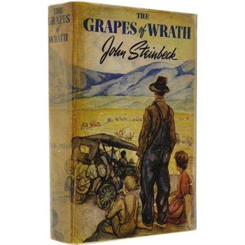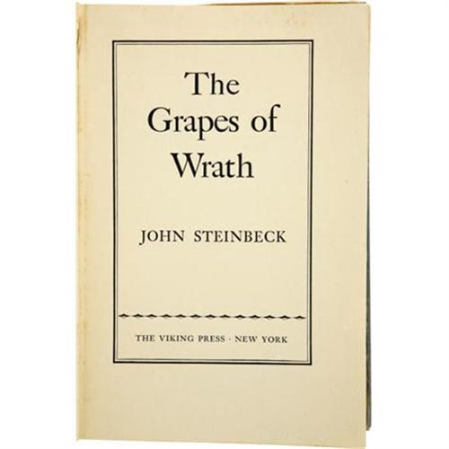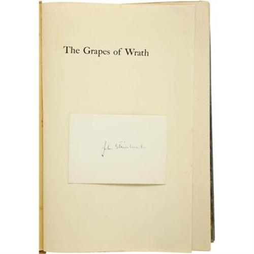 <B>John Steinbeck: First Edition of <I>The Grapes of Wrath</B></I></B></I> <B>with Signed Card Laid In</B></I> (New York: The Viking Press, 1939), first edition, 619 pages, tan cloth with brown lettering, 8vo (5.5" x 8.25"), first state dust jacket with "FIRST EDITION" on inner front flap. A signature card signed "<I>John Steinbeck</B></I>" is laid in. The book is near very good, with foxing to the text edges, and a loose front hinge at the title page. The price-clipped dust jacket is in good condition.<BR><BR><b>Shipping:</b> Books & Catalogs (<a target="_blank" href="http://www.heritageauctions.com/common/shipping.php">view shipping information</a>)