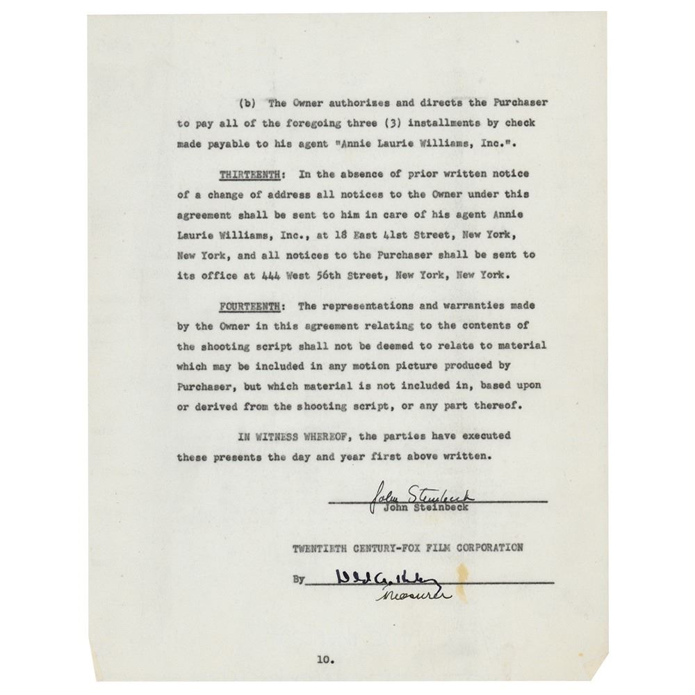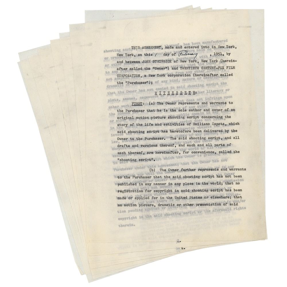 DS, ten pages, 8.5 x 11, February 1, 1951. Agreement between Steinbeck and Twentieth Century-Fox in which the author agrees to sell the rights of "an original motion picture shooting script concerning the story of the life and activities of Emiliano Zapata" for the sum of $75,000. Signed at the conclusion in fountain pen by Steinbeck and countersigned by the studio's treasurer. In fine condition.