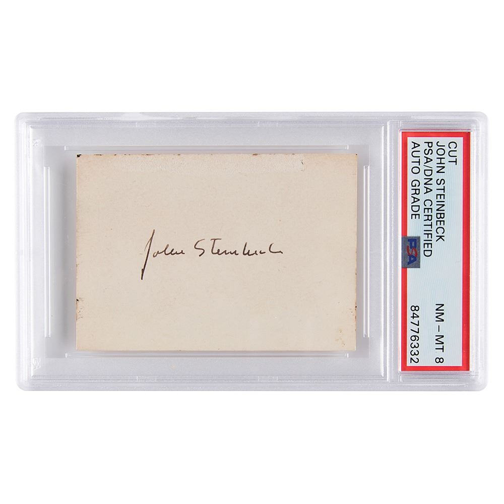 Vintage fountain pen signature, "John Steinbeck,& rdquo; on an off-white 3 x 2.25 card. In fine condition, with minor surface loss along the top edge. Encapsulated and graded by PSA/DNA as "NM-MT 8."
