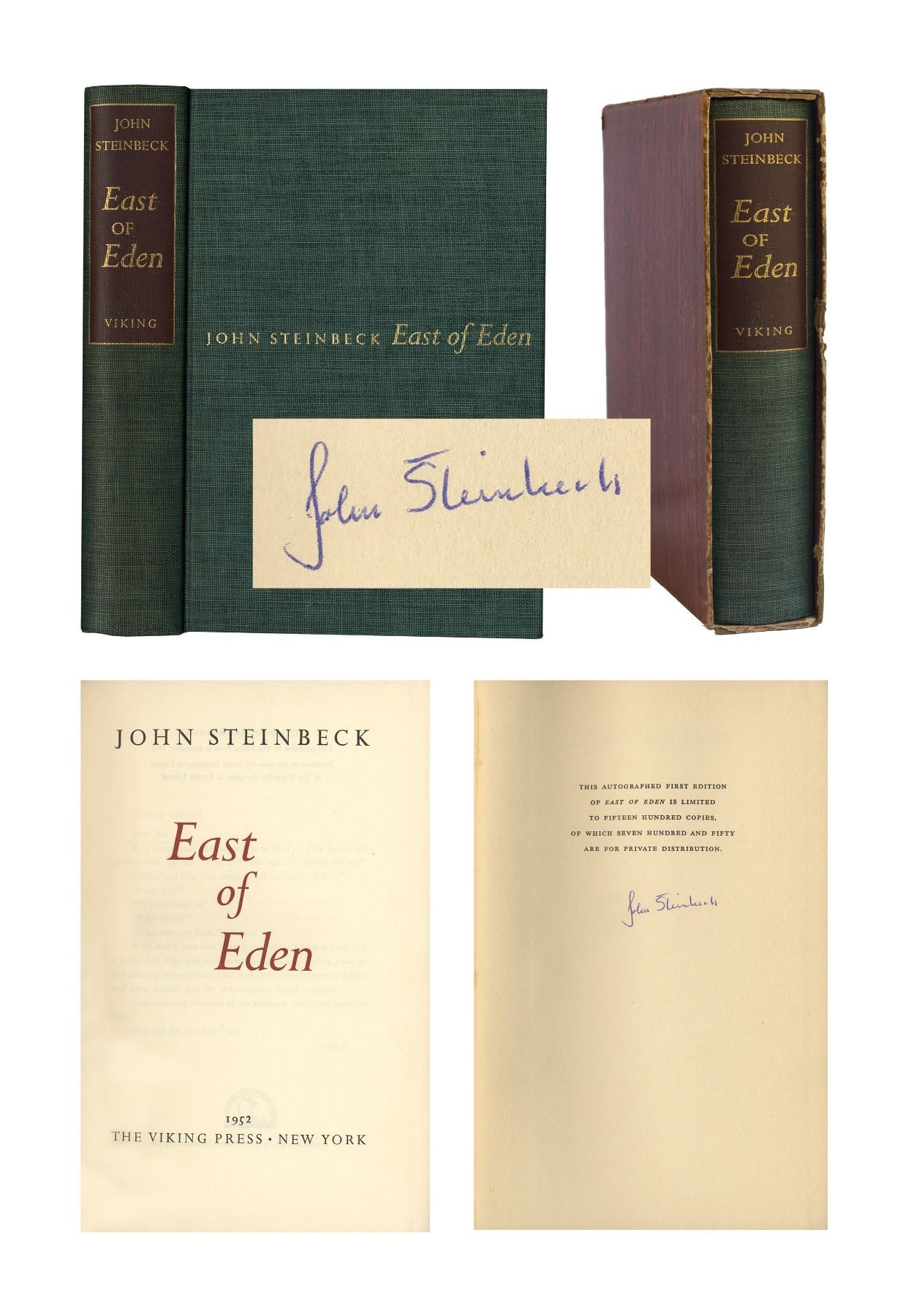 John Steinbeck signed first edition of ''East of Eden'' in its original slipcase. New York: Viking Press, 1952. One of just 1,500 first edition copies signed by the author, 750 of which were intended for private distribution. Signed, ''John Steinbeck'' in blue ink to limitation page. Bound in publisher's green cloth boards with titles stamped in gilt on the front board and spine, housed in original faux wood-grain slipcase. Measures 6.75'' x 9.5''. Slipcase is lightly chipped with a few abrasions, overall very good condition. Book is in exceptional, near fine condition.