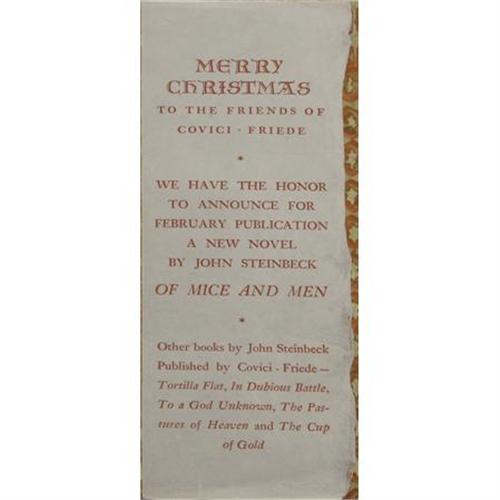 <B>John Steinbeck Signed & Numbered First Edition: <I>Saint Katy the Virgin</B></I></B></I> (New York: Covici-Friede, 1936), first edition, #103 of 199 copies signed and numbered by Steinbeck, 25 pages, orange and gilt decorative boards, 16mo (4.75" x 6.75"), protective tri-fold cover and slipcase, includes the rarely-present publisher's Christmas card announcing the upcoming publication of Steinbeck's <I>Of Mice and Men</B></I> the following February. This is one of Steinbeck's most peculiar stories, a farcical history of the religious conversion and eventual canonization of a fourteenth-century French pig. He had a strong personal attraction to the story and, after years of trying to get it published, he arranged with Covici-Friede to issue it as this gift book. Fine condition, original owner's bookplate present on inside front cover.