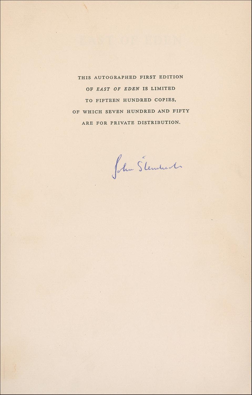 Signed book: East of Eden. Limited edition first edition of 1500 copies. NY: Viking Press, 1952. Hardcover, 6.25 x 9.25, 602 pages. Signed in blue ink on the limitations page. In fine condition, with staining to a few interior pages, scuffing to the boards, and wear to the coloring of the spine. Steinbeck considered East of Eden to be his best and most significant literary work, and signed copies are highly desirable.