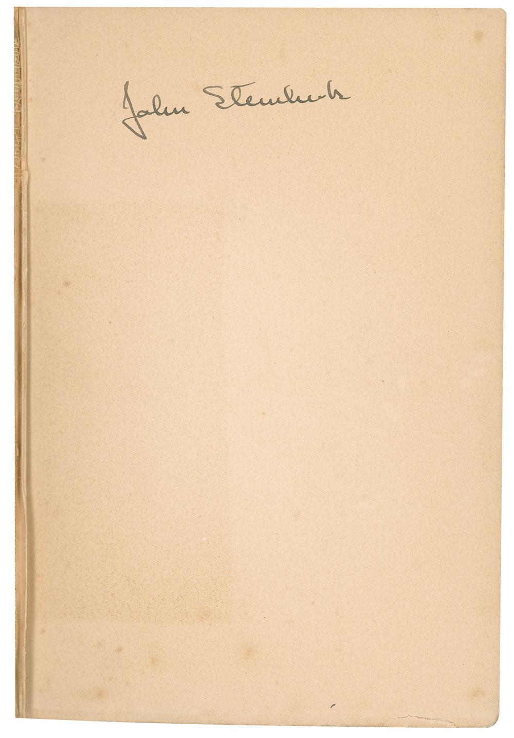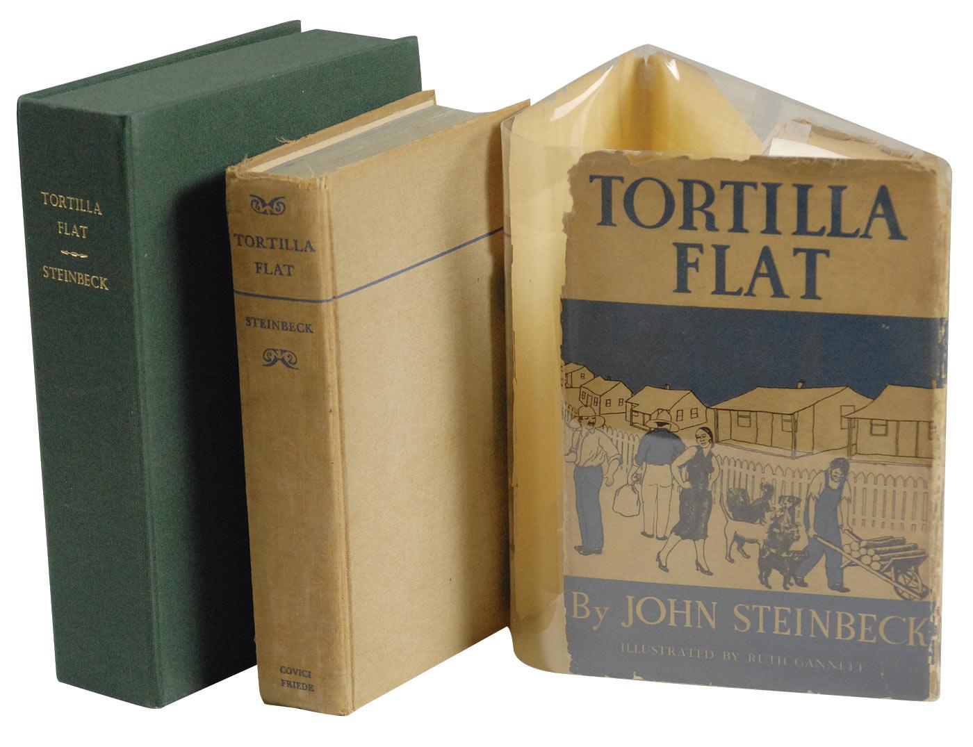 Signed book: Tortilla Flat. First edition. NY: Covici Friede, 1935. Hardcover with dustjacket, 5.5 x 8, 316 pages. Boldly signed in fountain pen on the first free end page, “John Steinbeck.” Light foxing and a light block of toning to the signed page, small tear to the first free end page, fragile and nearly complete splitting of the front and back boards along the hinges, foxing to the pages and end paper, and moderate soiling to the boards heavier to the spine, otherwise very good condition. The dustjacket rates fair with moderate soiling, the dustjacket spine missing, edge chipping, and clipped corners. Despite the flaws, Steinbeck’s signature remains bold and unaffected. Stored in a custom-made slipcase, this is a most desirable signed first edition.