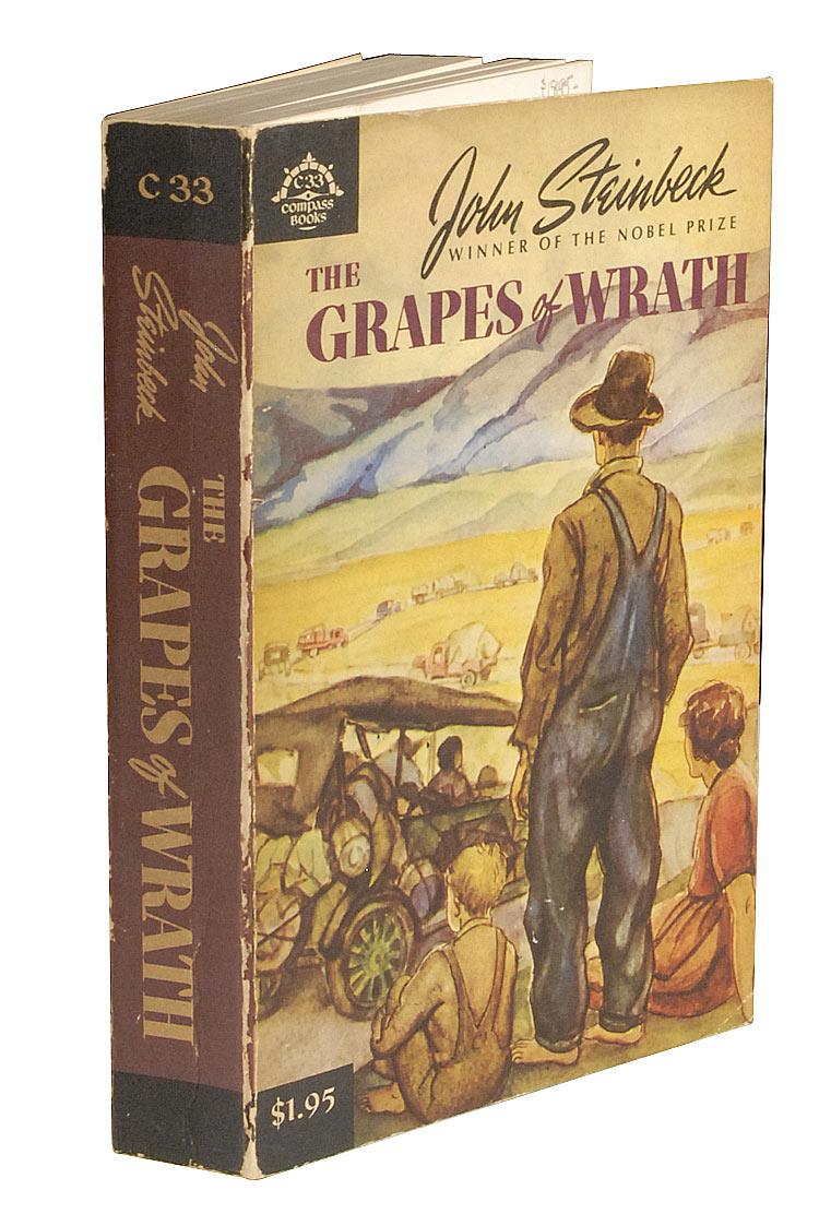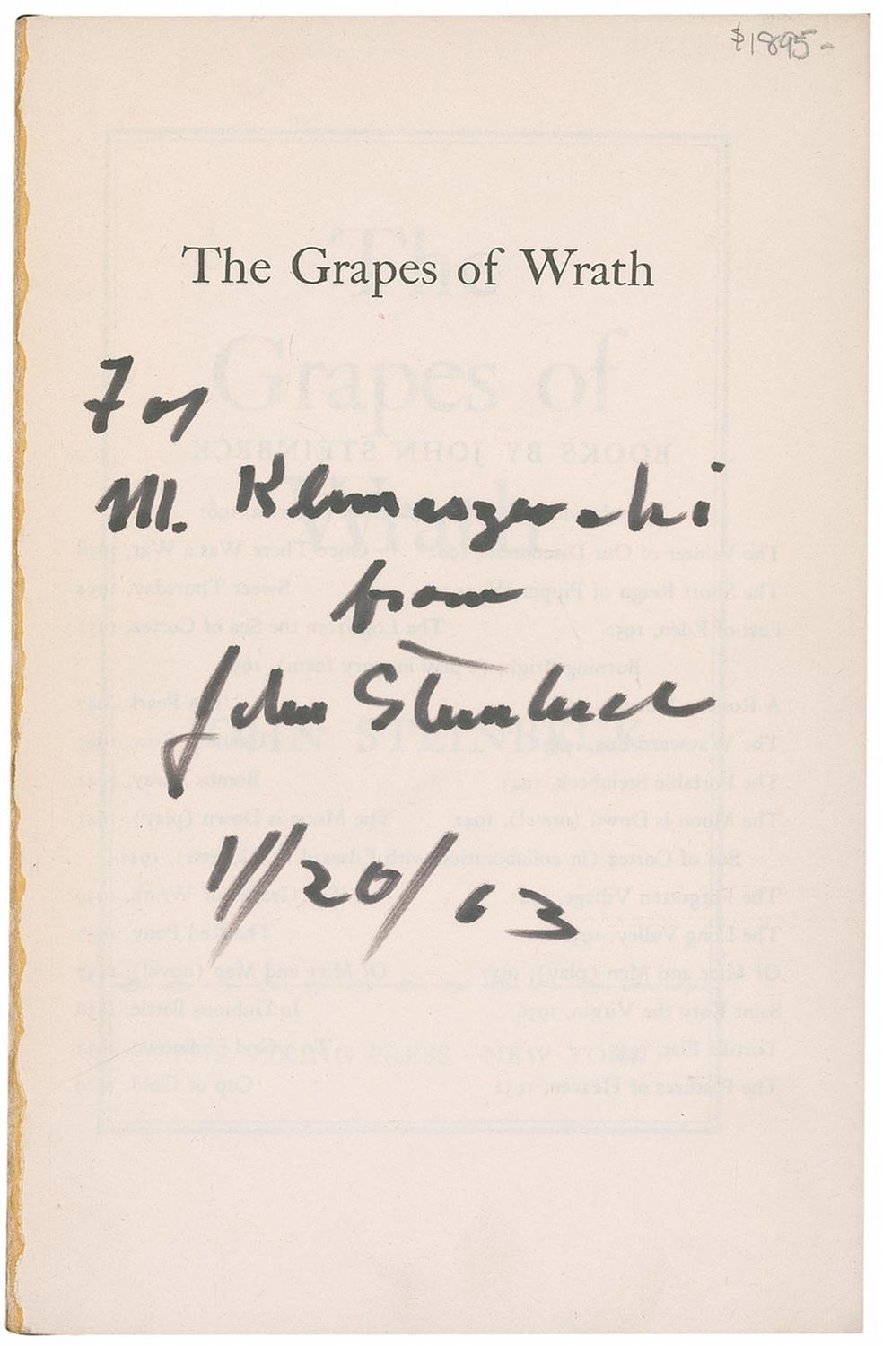 Signed book: The Grapes of Wrath. Later printing. NY: Viking Press, 1963. Paperback, 5 x 7.75, 619 pages. Signed and inscribed on the half-title page, “For MI. Klemaszewski from John Steinbeck 11/20/63.” In very good condition, with partial separation to front hinge, small pencil notation to top of signed page, scattered soiling to covers, and light wear to both joints. A fine example of the famous title, which was integral to Steinbeck winning the Nobel Prize for Literature in 1962.