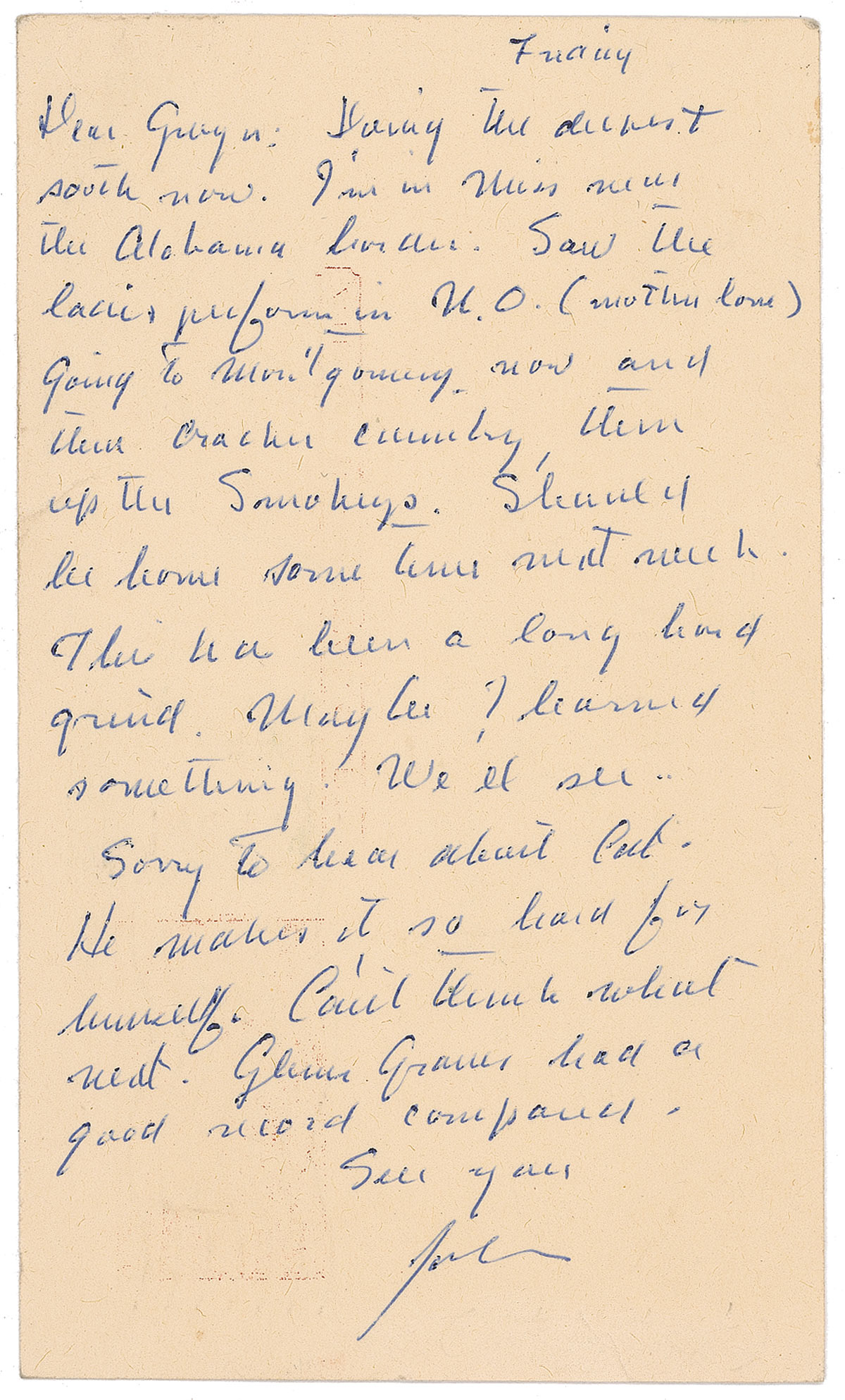 ALS signed “John,” on a 3.25 x 5.5 postal card, no date, but postmarked Pelahatchie, Mississippi, December 3, 1960. Letter to his wife Gwyn. In full: “Doing the deepest south now. I’m in Miss near the Alabama border. Saw the ladies[?] perform in N[ew] O[rleans] (mother love). Going to Montgomery now and then Cracker country, then up the Smokeys. Should be home some time next week. This has been a long hard grind. Maybe I learned something. We’ll see. Sorry to hear about Cat. Makes it so hard for himself. Can’t think what next. Glenn Graves had a good record company. See you. John.” Steinbeck has addressed the reverse of the postcard to Gwyn Steinbeck, and postcard also bears a rubber-stamped winged pig and “Miyagus.” In fine condition, with a few light creases, and light impressions and show-through from postal marks on reverse.