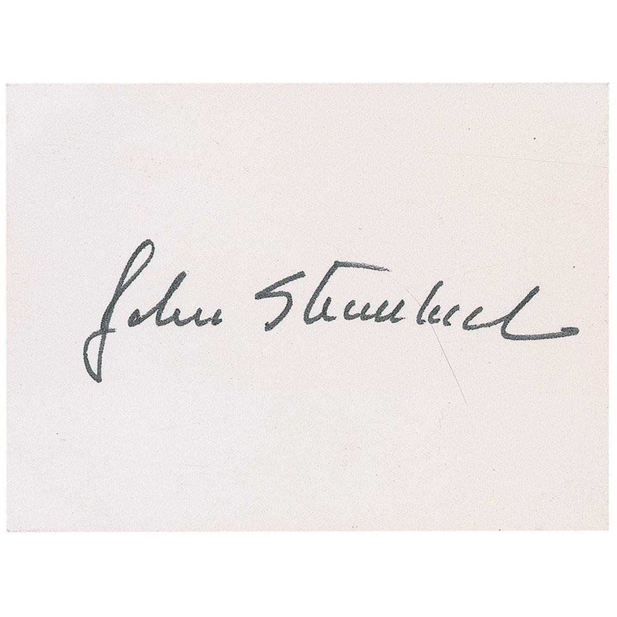 Felt tip signature, “John Steinbeck,” on an off-white 3.5 x 2.5 card. In fine condition, with vertical creasing slightly affecting the end of the signature, and a pencil notation in another hand on the reverse. James Spence authentication sticker affixed to the reverse.