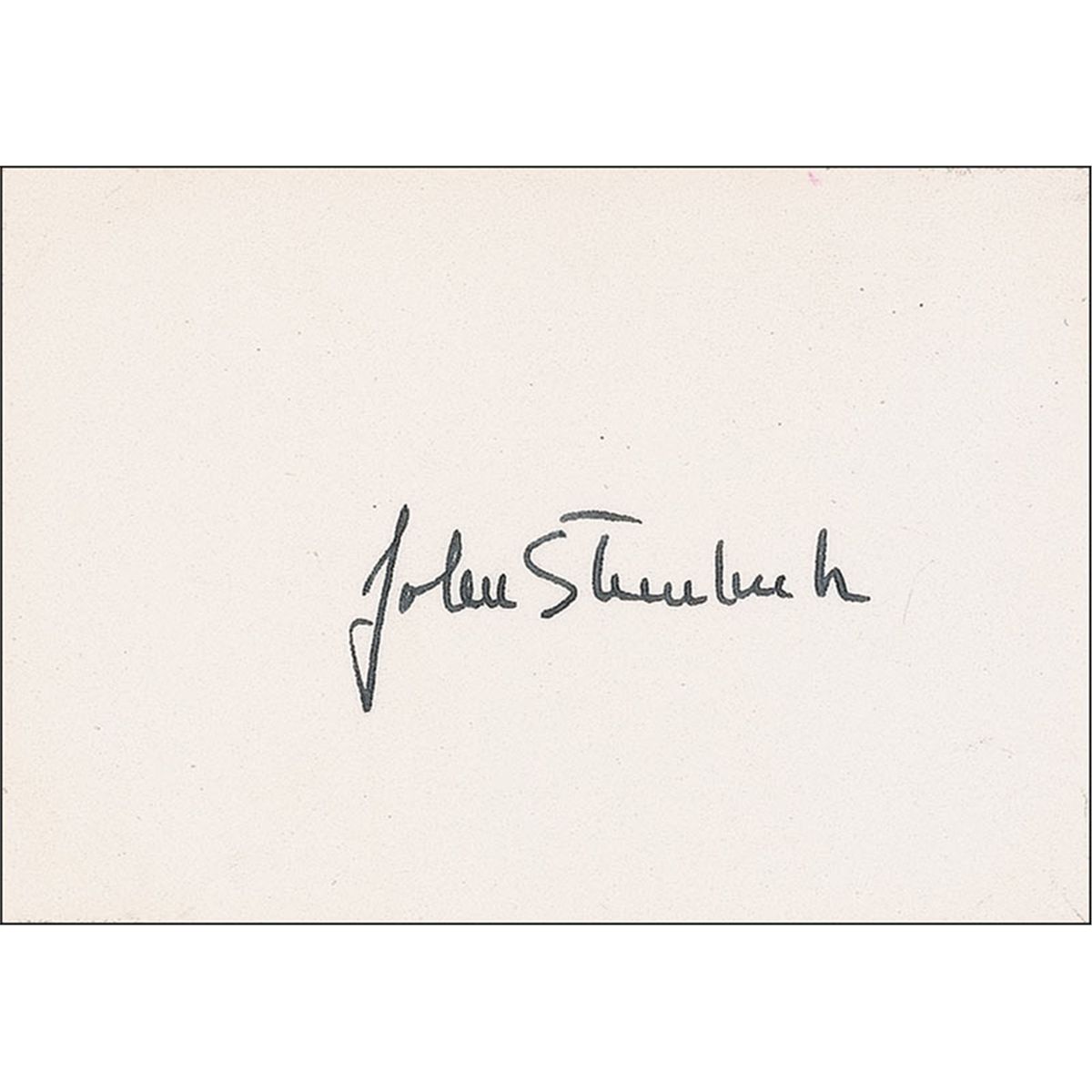 Crisp vintage fountain pen signature, “John Steinbeck,” on an off-white 3 x 2 card. In fine condition, with a trivial horizontal crease below the signature.