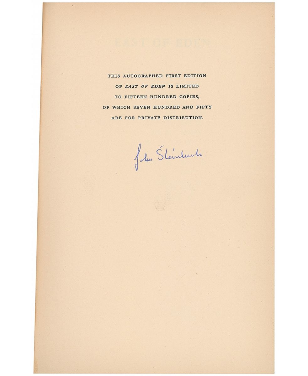Signed book: East of Eden. Limited edition, first edition of 1500 copies. NY: Viking Press, 1952. Hardcover, 6.25 x 9.25, 602 pages. Signed on the limitations page in blue ink by Steinbeck. In fine condition, with owner’s signature to first free end page, some slight discoloration to fore-edges, and some trivial wear to spine.