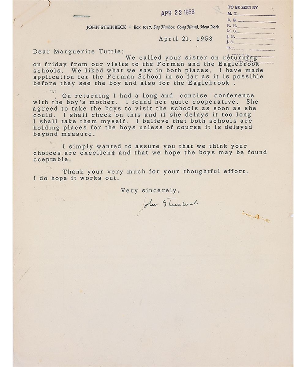 TLS, one page, 8.25 x 11, personal letterhead, April 21, 1958. Letter to Marguerite Tuttle. In full “We called your sister on returning on friday [sic] from our visits to the Forman and the Eaglebrook schools. We liked what we saw in both places. I have made application for the Forman School in so far as it is possible before they see the boy and also for the Eaglebrook. On returning I had a long and concise conference with the boy’s mother. I found her quite cooperative. She agreed to take the boys to visit the schools as soon as she could. I shall check on this and if she delays it too long I shall take them myself. I believe that both schools are holding places for the boys unless of course it is delayed beyond measure. I simply wanted to assure you that we think your choices are excellent and that we hope the boys may be found cceptable [sic]. Thank your [sic] very much for your thoughtful effort. I do hope it works out.” A staple and rusty paperclip mark to top left and an office stamp to top right, otherwise fine condition.