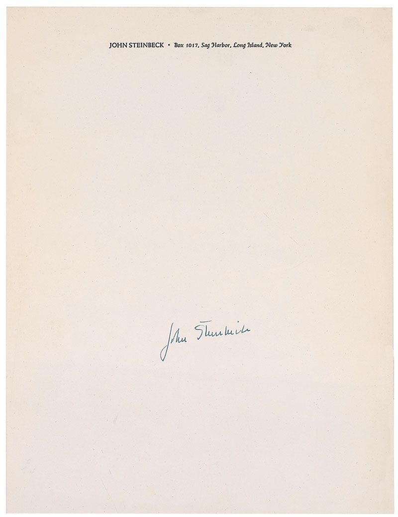 Crisp vintage ink signature, “John Steinbeck,” on an off-white 8.5 x 11 sheet of his personal stationery. In very fine condition.