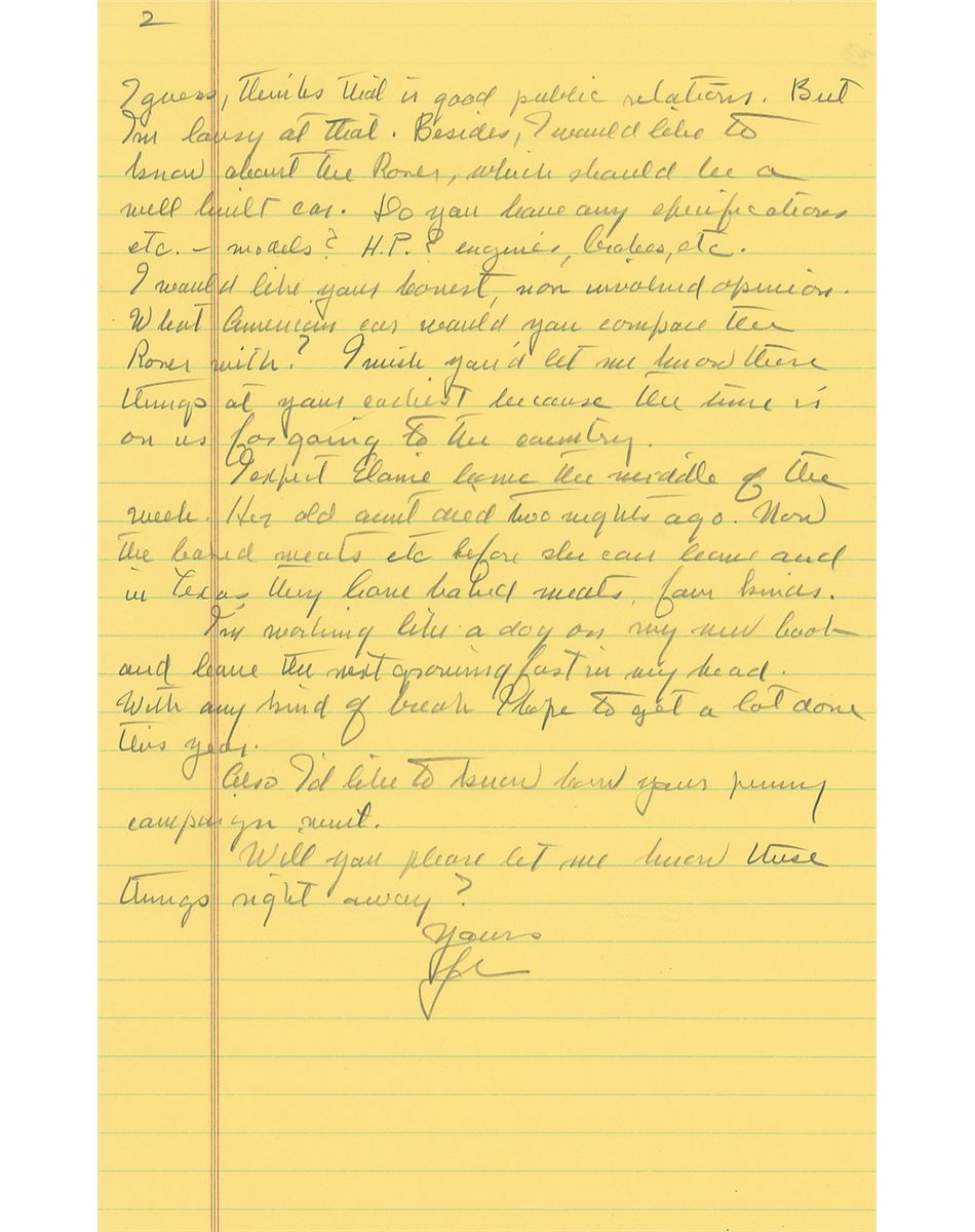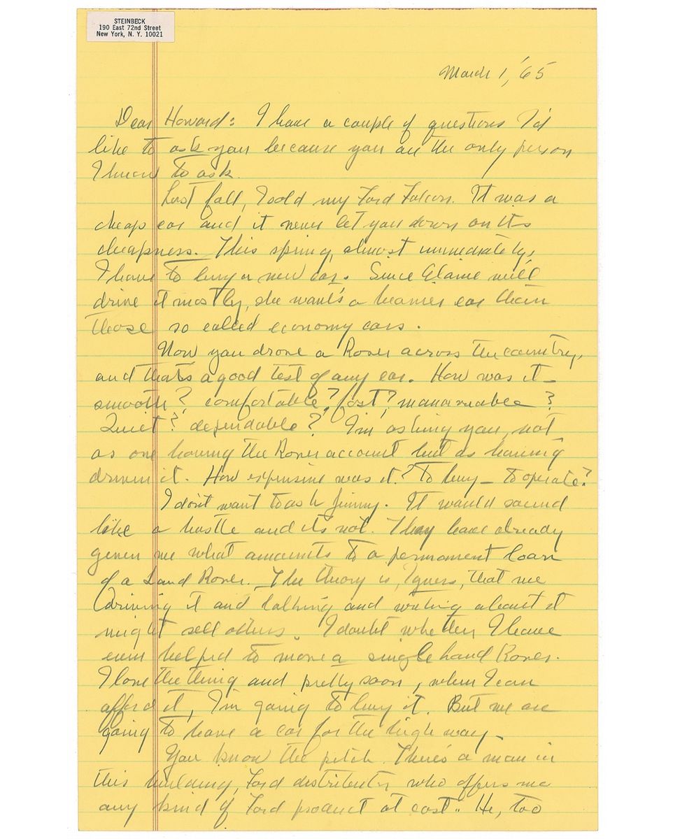 Lengthy ALS in pencil, signed “John,” two pages, lightly-lined, 8 x 12.5, March 1, 1965. Letter to advertising pioneer Howard Gossage, who had enlisted Steinbeck’s assistance with his Rover automobile advertising campaign. In part: “I have a couple of questions I'd like to ask you because you are the only person I know to ask. Last fall, I sold my Ford Falcon. It was a cheap car and it never let you down on its cheapness. This spring, almost immediately, I have to buy a new car, Since Elaine will drive it mostly, she wants a heavier car than those so called economy cars. Now you drove a Rover across the country, and that's a good test of any car. How was it—smooth? comfortable? fast? maneuverable? quiet? dependable? I'm asking you, not as one having the Rover account but as having driven it. How expensive was it? To buy—to operate? I don't want to ask Jimmy. It would sound like a hustle and it's not. They have already given me what amounts to a permanent loan of a Land Rover. The theory is, I guess, that me driving it and talking and writing about it might sell others. I doubt whether I have ever helped to move a single Land Rover. I love the thing and pretty soon, when I can afford it, I'm going to buy it…What American car would you compare the Rover with? I wish you'd let me know these things at your earliest because the time is on us for going to the country…I'm working like a dog on my new book and have the next growing fast in my head. With any kind of break I hope to get a lot done this year." In fine condition. Steinbeck would release the America and Americans the following year in 1966, a collection of his finest essays and journalistic pieces as well as his final book.