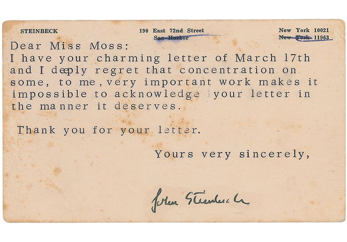TLS, one page on a 5.5 x 3.25 postcard, no date. Letter to Diana Moss, in part: “I have your charming letter of March 17th and I deeply regret that concentration on some, to me, very important work makes it impossible to acknowledge your letter in the manner it deserves.” In very good condition, with scattered foxing, creasing to corners, ink marks through Steinbeck’s second address, and a PSA/DNA label affixed to the reverse.