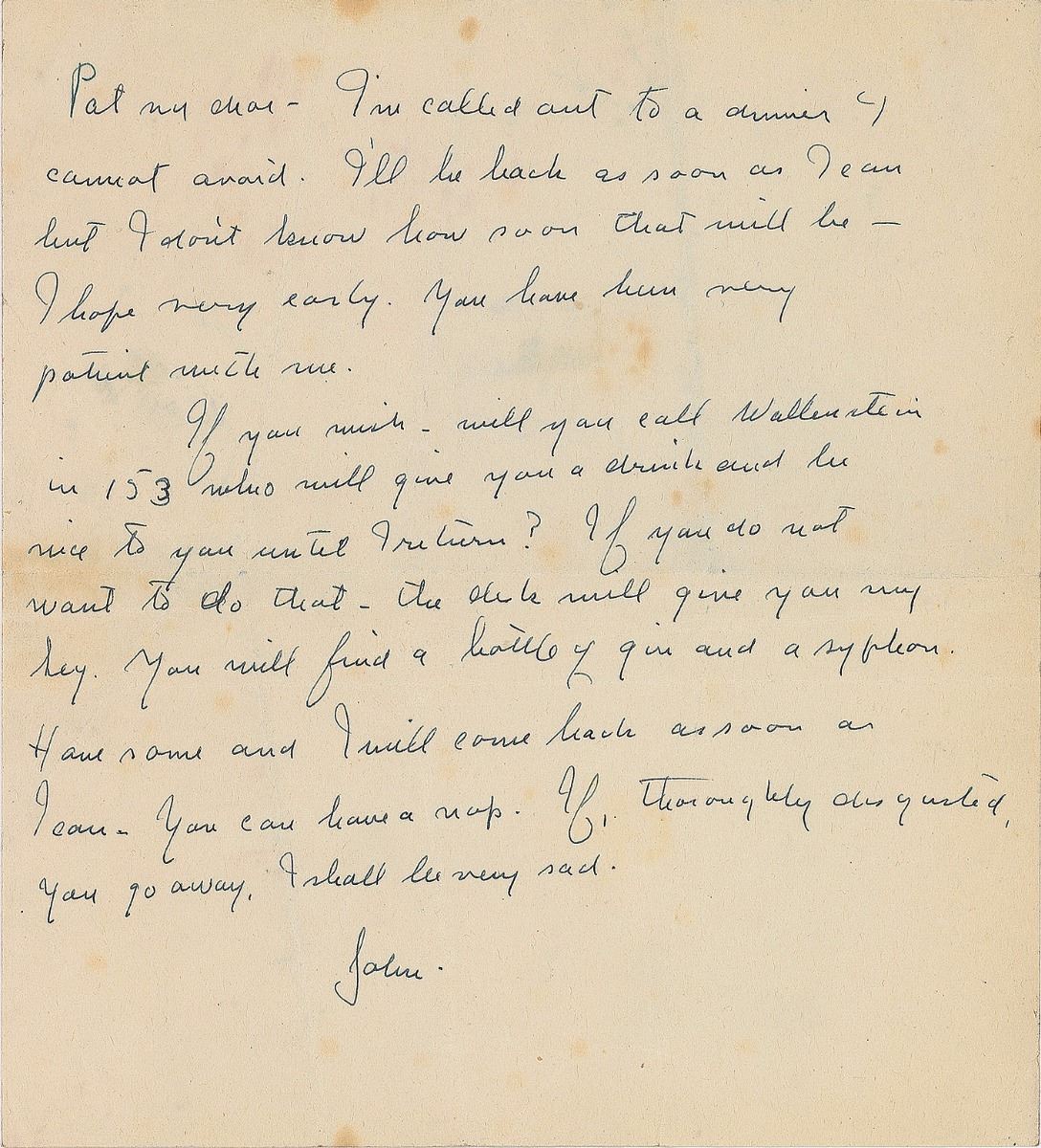 ALS signed “John,” one page, 6.25 x 7, no date. Letter to editor Pascal Covici, in part: “I’m called out to a dinner I cannot avoid. I’ll be back as soon as I can but I don’t know how soon that will be. I hope very early. You have been very patient with me. If you wish—will you call Wallenstein in 153 who will give you a drink and be nice to you until I return? If you do not want to do that, the clerk will give you my key. You will find a bottle of gin and a syphon. Have some and I will come back as soon as I can. You can have a nap. If, thoroughly disgusted, you go away, I shall be very sad.” In very good condition.