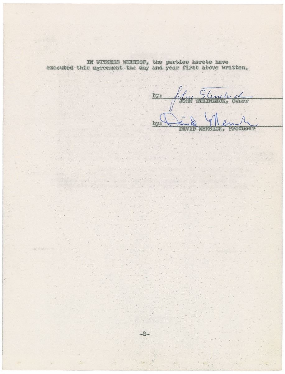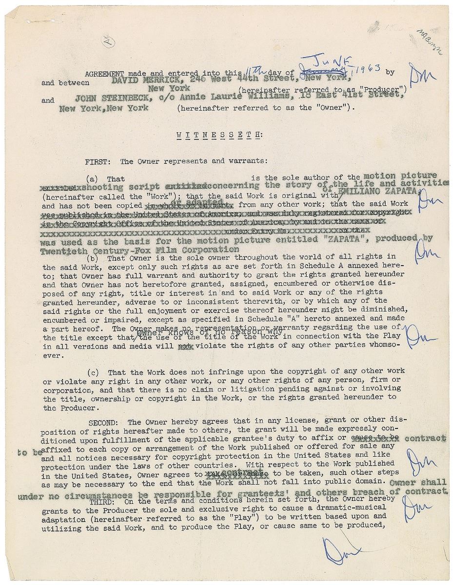 DS, eight pages, 8.5 x 11, June 11, 1963. Agreement between Steinbeck and David Merrick for a stage adaptation of the film Viva Zapata!, in which Steinbeck confirms he “is the sole author of the motion picture shooting script concerning the story of the life and activities of Emiliano Zapata…used as the basis for the motion picture entitled ‘Zapata,’ produced by Twentieth Century-Fox Film Corporation.” Signed at the conclusion in ballpoint by Steinbeck as the owner and Merrick as the producer. Also initialed throughout by Merrick to approve changes and revisions to the text. In fine condition.