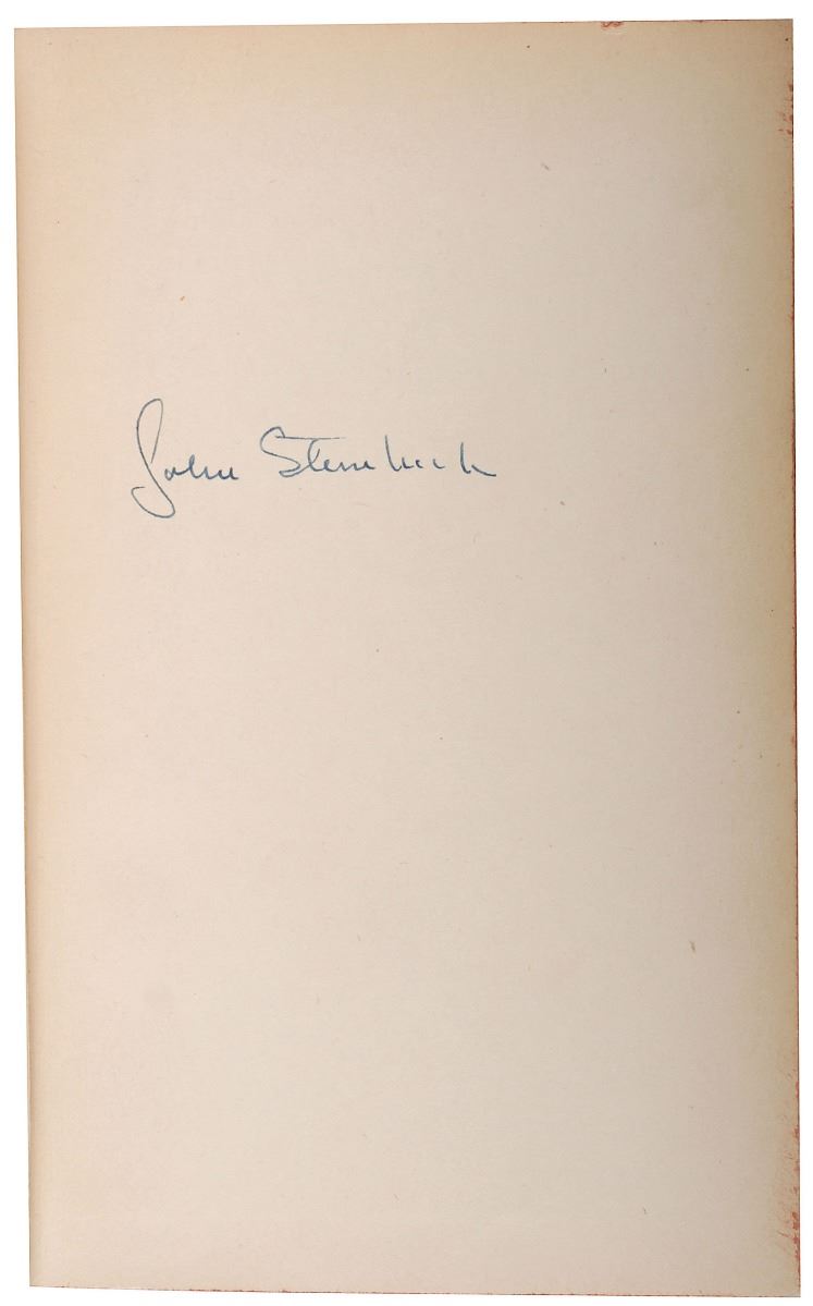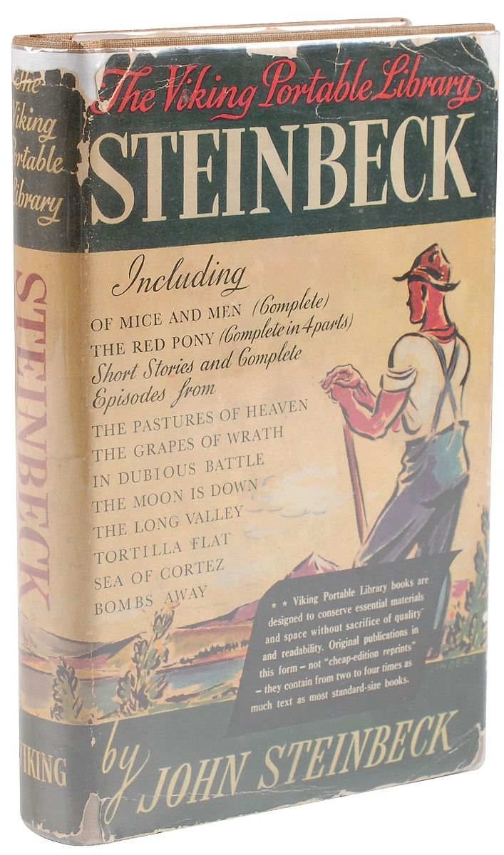 Signed book: The Viking Portable Library of Steinbeck. Later printing. NY: Viking Press, 1943. Hardcover with dust jacket, 4.5 x 7, 568 pages. Signed on the first free end page in blue ink. In fine condition, with some mild toning to textblock edges.