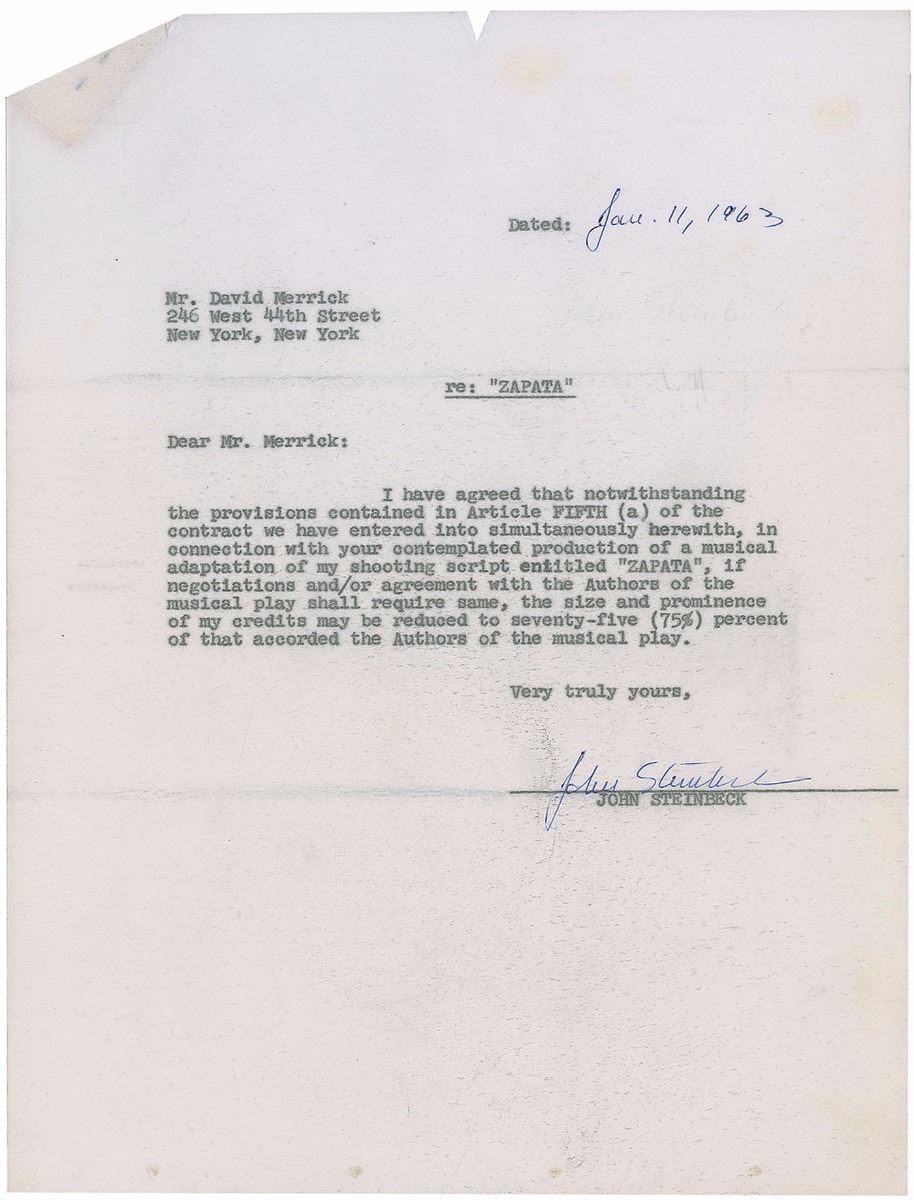 DS, three onionskin pages, 8.5 x 11, January 11, 1963. Agreement between Steinbeck and David Merrick granting rights to turn his Viva Zapata! screenplay into a musical, in part: “I have agreed that…in connection with your contemplated production of a musical adaptation of my shooting script entitled ‘Zapata,’ if negotiations and/or agreement with the Authors of the musical play shall require same, the size and prominence of my credits may be reduced to seventy-five (75%) percent of that accorded the Authors of the musical play.” Signed and dated on the last page in blue ballpoint by Steinbeck; the second page initialed by Merrick. Includes a packet of terms for a revised schedule. In fine condition. Accompanied by a letter from Steinbeck’s literary agent, Annie Laurie William, signed by Merrick’s lawyer Benjamin Aslan.