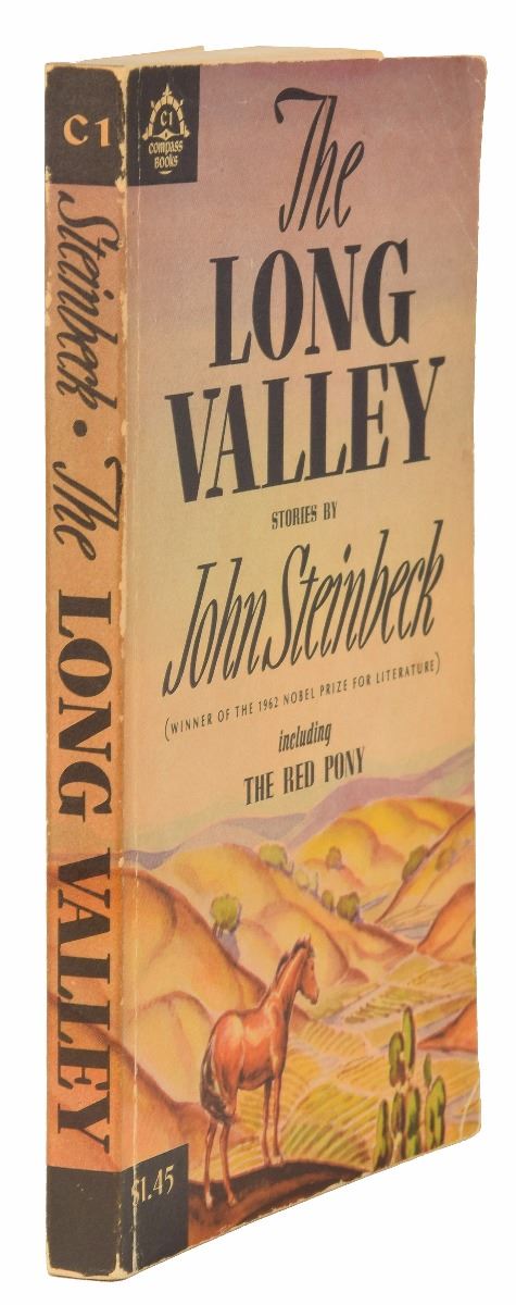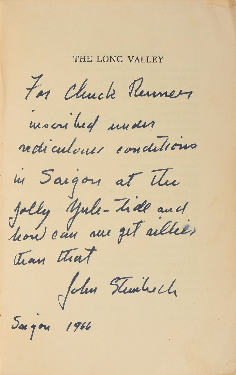 Signed book: The Long Valley. Sixth printing. NY: Viking Press, 1964. Softcover, 5 x 7.75, 303 pages. Boldly signed and inscribed on the half-title page in fountain pen, "For Chuck Rumer, inscribed under ridiculous conditions in Saigon at the jolly yule-tide and how can one get sillier than that. John Steinbeck, Saigon 1966." Autographic condition: fine. Book condition: VG/None, with some scuffing and bumps to spine and covers. Accompanied by a custom-made clamshell case. In 1966, at the urging of President Lyndon B. Johnson and the suggestion of Long Island's Newsday paper, Steinbeck accepted an assignment as a roving reporter in Southeast Asia. Between December 1966 and May 1967, he wrote 86 stories for the newspaper. These dispatches would be the last work published during his lifetime. Inscribed at Christmastime just after his arrival in the war-torn nation, this is an especially significant signed Steinbeck book.