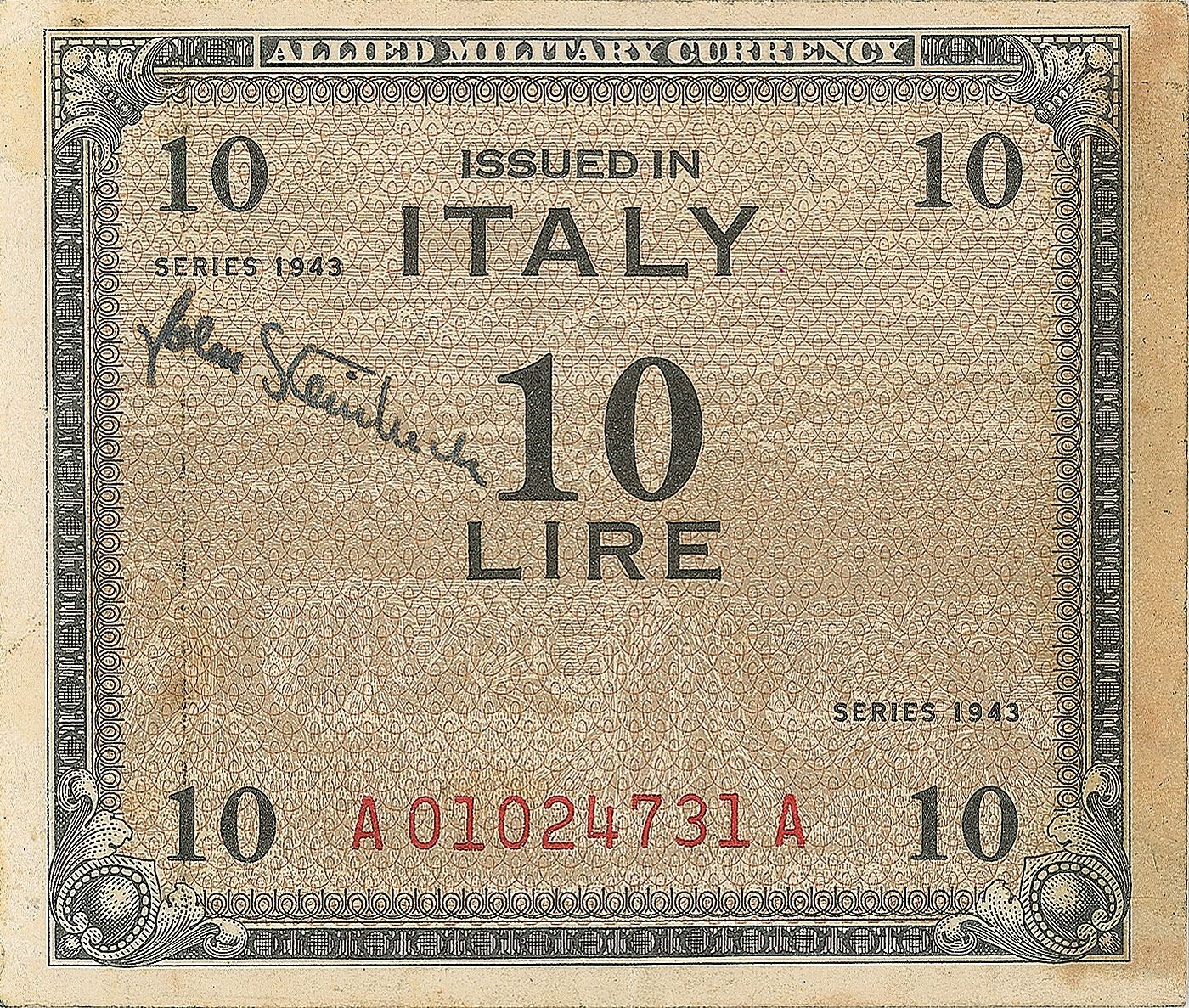 Allied Military Currency issued in Italy in 1943 for 10 lire, 3 x 2.5, boldly signed in fountain pen by the author, "John Steinbeck." In fine condition, with light staining along the right border. In 1943, Steinbeck served as an overseas World War II war correspondent for the New York Herald Tribune.