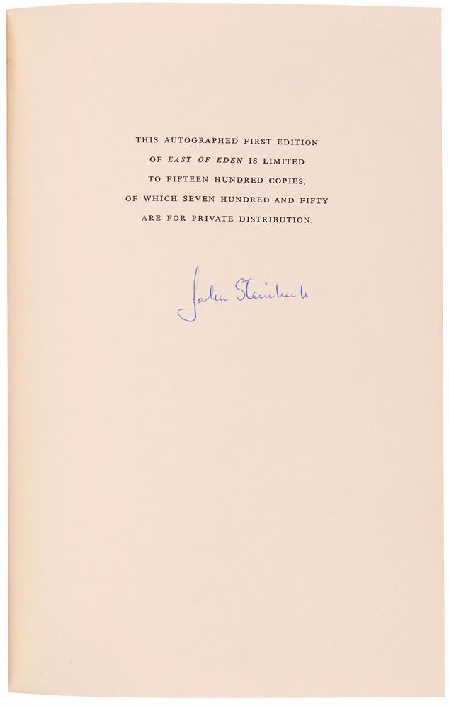 Signed book: East of Eden. First edition, limited issue of 1500. NY: Viking Press, 1952. Hardcover, 6.25 x 9.25, 602 pages. Signed on the colophon in blue ballpoint. Autographic condition: very fine. Book condition: VG+/None, with rubbing to spine. Steinbeck considered East of Eden to be his best and most significant literary work, and signed first editions are highly desirable.