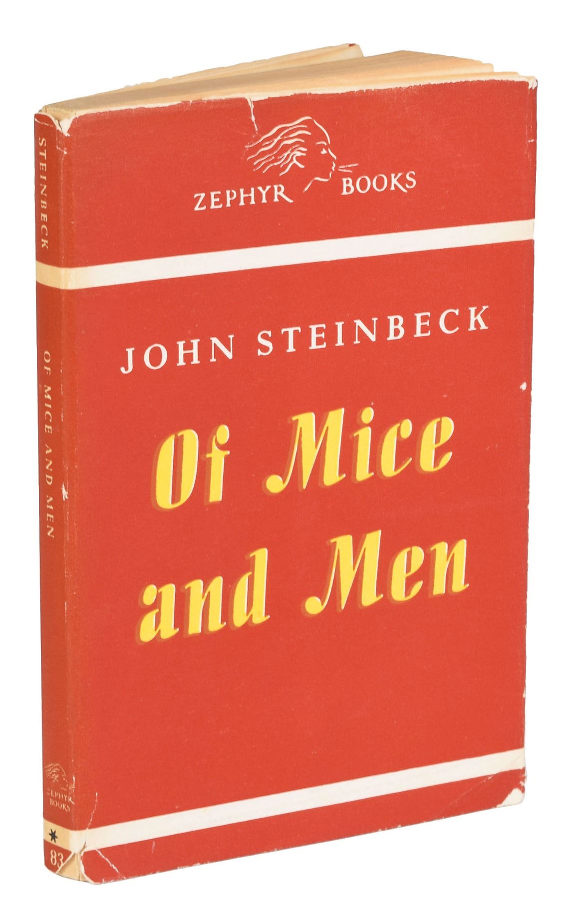 Signed book: Of Mice and Men. Later printing. Stockholm: Zephyr Books, 1945. Softcover with dust jacket, 4.75 x 7.25, 186 pages. Signed on the half-title page in black ink by Steinbeck. Autographic condition: fine. Book condition: VG/VG, with the binding threads securing the signed page somewhat stretched and loose, and a few chips and edge tears to the dust jacket.