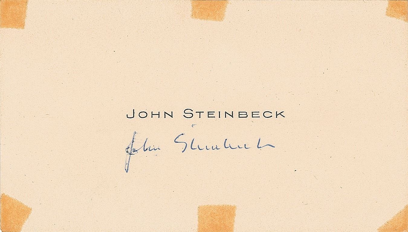 Ballpoint signature, "John Steinbeck," on an off-white 3.75 x 2 calling card belonging to Steinbeck. In fine condition, with six small tape stains to the edges, easily matted out.