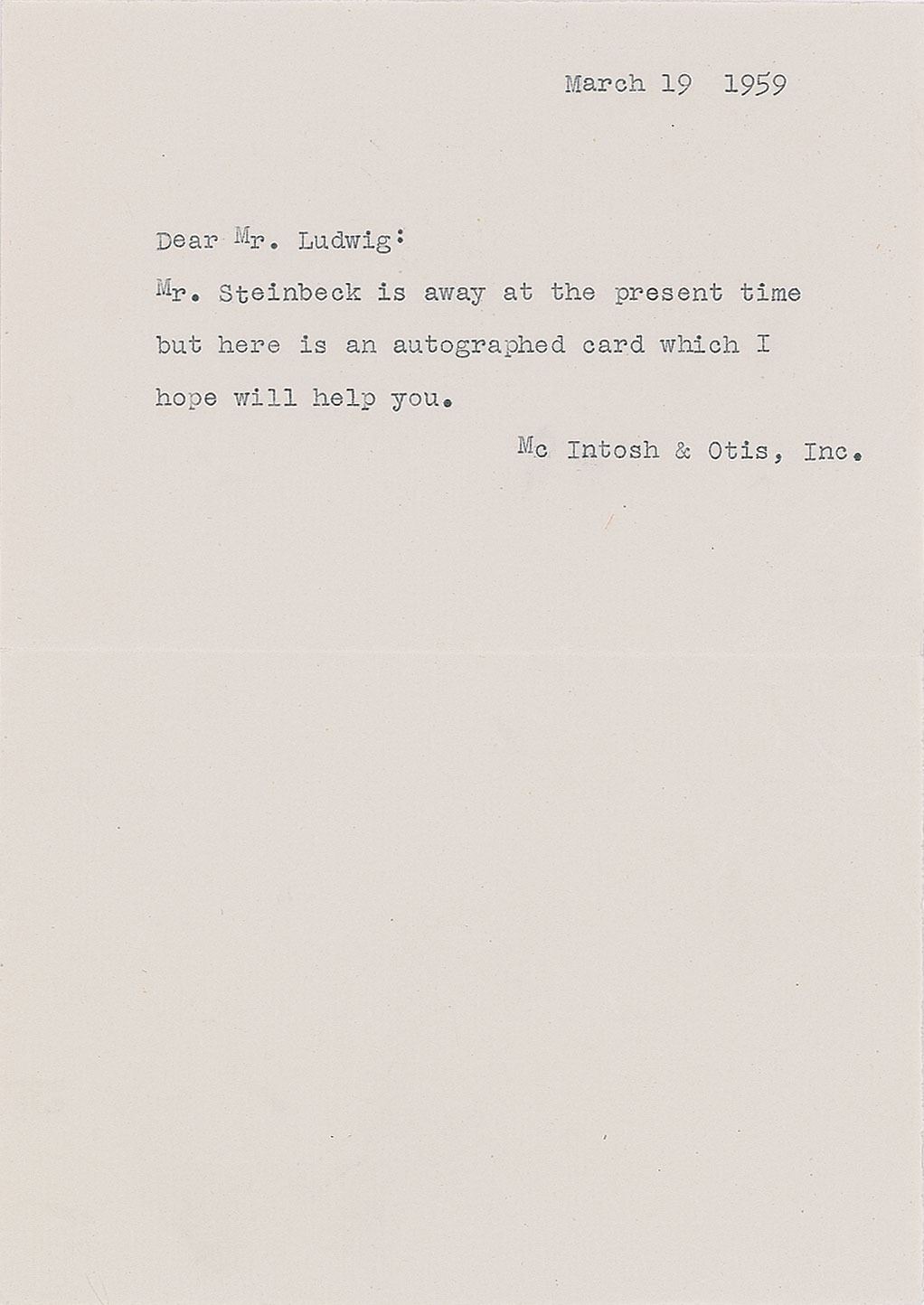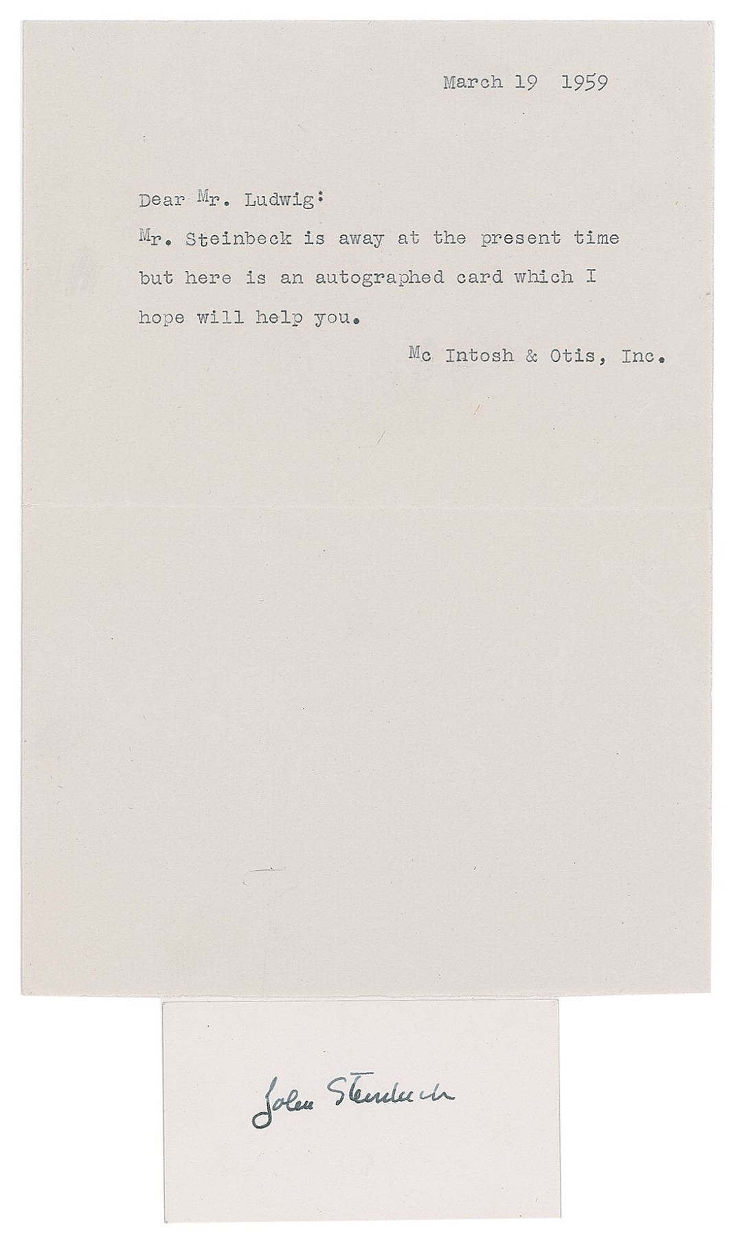 Choice vintage fountain pen signature, "John Steinbeck,” on an off-white 3.5 x 1.75 card. In very fine condition. Accompanied by a transmittal letter from his literary agency, McIntosh & Otis, dated March 19, 1959.