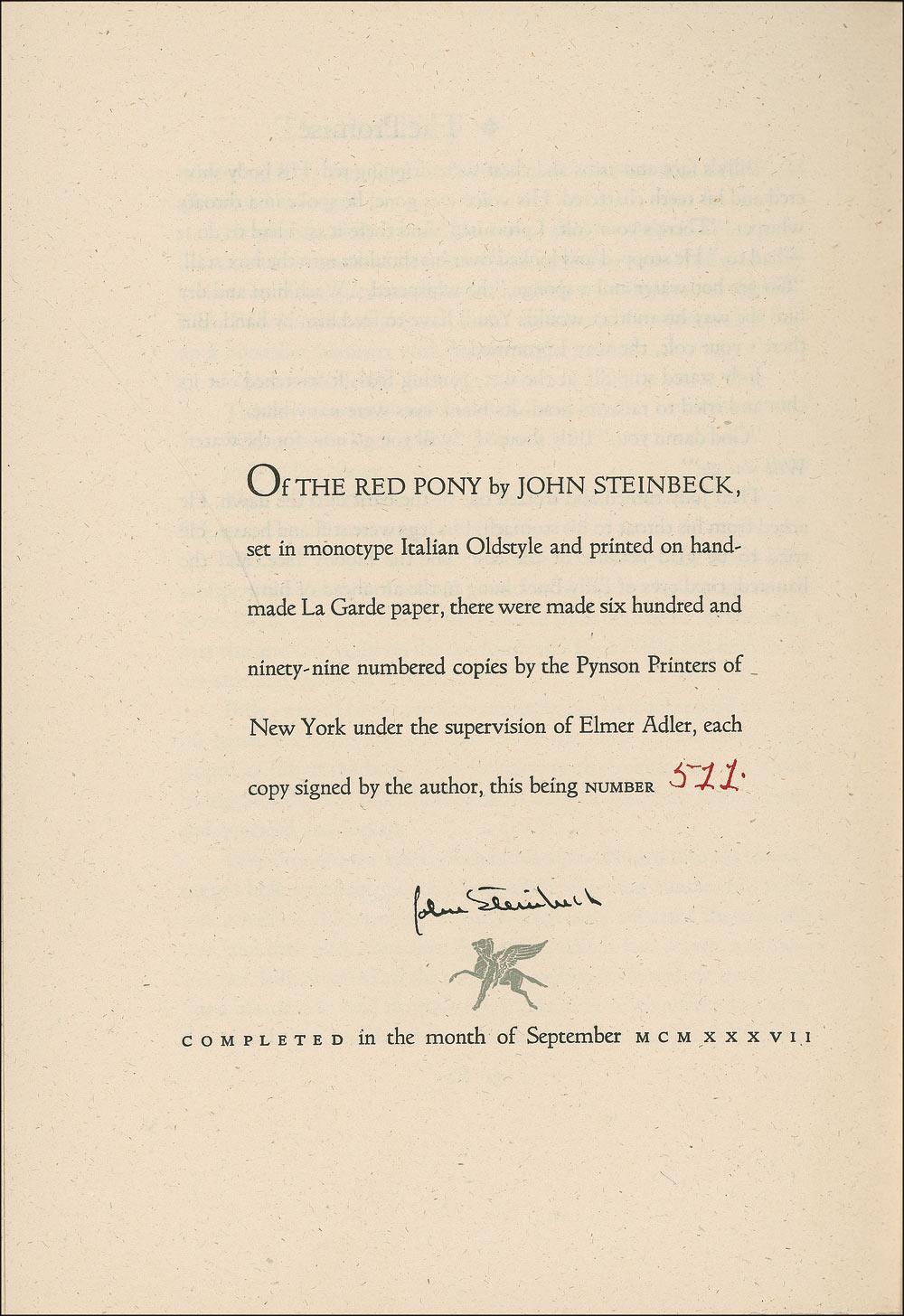 Signed book: The Red Pony. Limited signed edition of 699 copies (this copy No. 511). NY: Covici Friede, 1937. Hardcover with slipcase, 7 x 10, 81 pages. Signed in black ink on the limitation page. In fine condition, with some subtle toning to covers, and sunning to spine resulting in some light fading. Slipcase also exhibits some scattered light wear.
