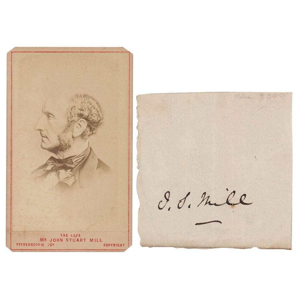 Bold and uncommon ink signature, "J. S. Mill,‰Û on an off-white 3 x 3 slip. In fine condition, with a vertical fold passing through Mill's last name. Accompanied by a carte-de-visite portrait published by the London Stereoscopic & Photographic Company.