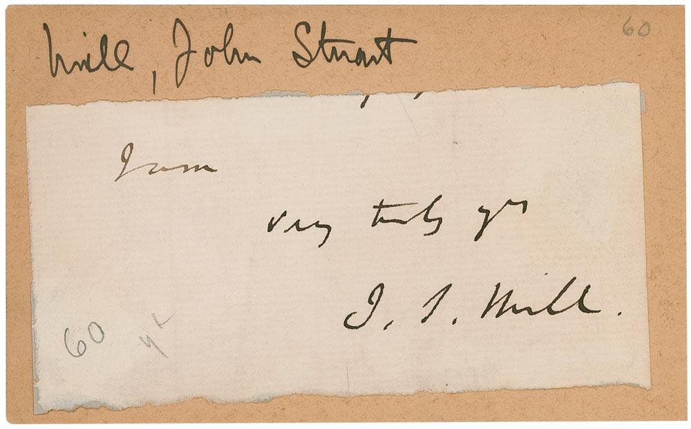 British philosopher and civil servant (1806–1873) who was an influential contributor to social theory, political theory, and political economy. Rare ink signature, “I am, Very truly yrs, J. S. Mill,” on an off-white 4.25 x 2 slip. Slip is affixed to the front of a slightly larger envelope. Some scattered light toning and soiling, and pencil notations to lower left, otherwise fine condition. Scarce in any form.