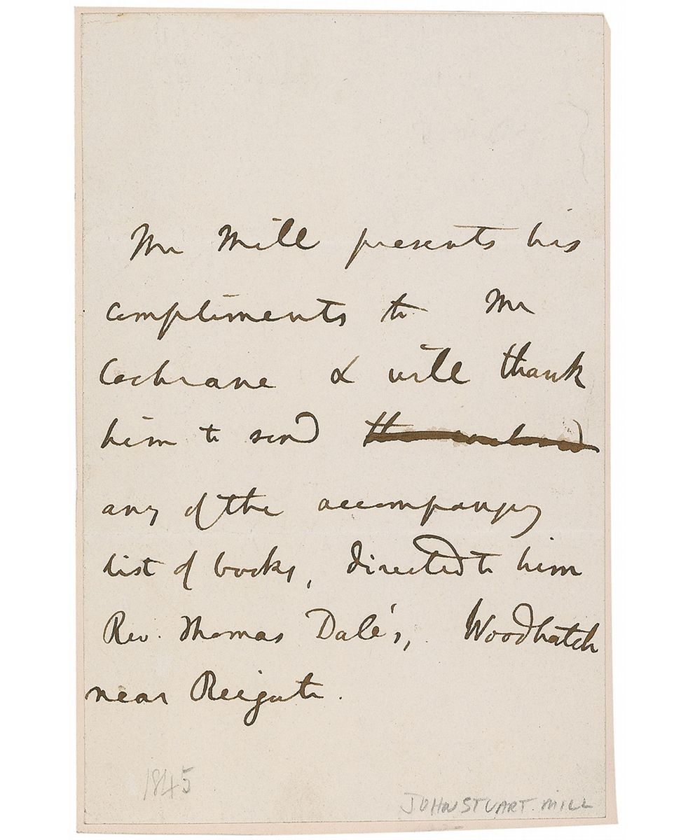 British philosopher and civil servant (1806–1873) who was an influential contributor to social theory, political theory, and political economy. Third-person ALS, one page, 4.5 x 7, no date. In part: “Mr. Mill presents his compliments to Mr. Cochrane & will thank him to send any of the accompanying list of books.” Letter is affixed by the reverse of its left edge to a slightly larger sheet. In fine condition, with pencil notations along bottom edge.
