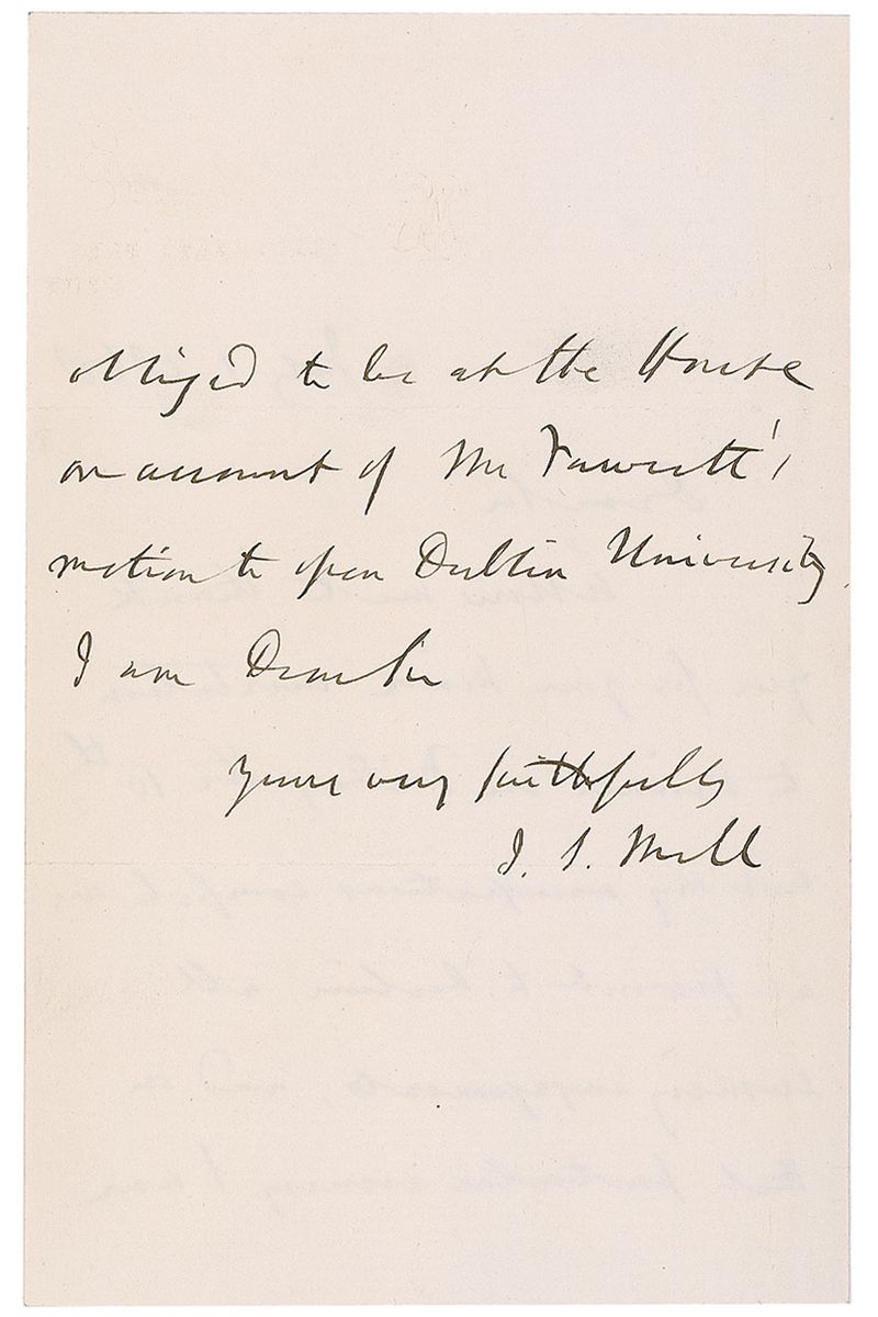 British philosopher and civil servant (1806–1873) who was an influential contributor to social theory, political theory, and political economy. ALS signed “J. S. Mill,” one page both sides, 4.5 x 7, personal letterhead, July 1, 1860. Letter to an unidentified gentleman. In part: “Allow me to thank you for your kind invitation to dinner…but my occupations compel me at present to decline all evening engagements, and on that particular evening I am obliged to be at the House on account of Mr. Fawcett’s motion to open Dublin University.” In fine condition, with a lightly trimmed left edge. Henry Fawcett, a blind member of Parliament, was a close friend of Mill’s and disputed the educational monopoly in Ireland of the University of Dublin.