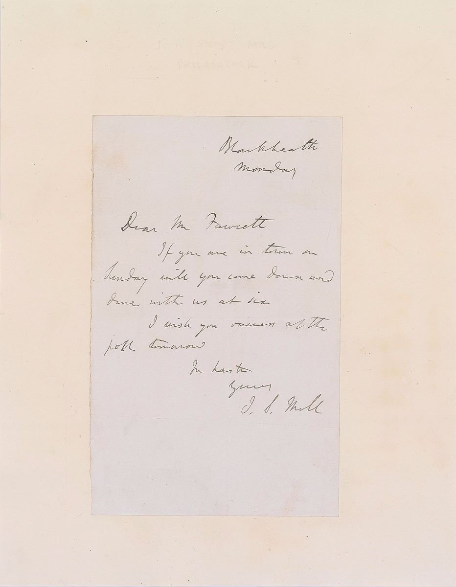 British philosopher and civil servant (1806–1873) who was an influential contributor to social theory, political theory, and political economy. ALS signed “J. S. Mill,” one page, 4.5 x 7, no date. Letter to Mr. Fawcett, in full: “If you are in town on Sunday will you come down and dine with us at six. I wish you success at the poll tomorrow.” Affixed to an off-white 8.25 x 10.5 sheet. In fine condition, with three horizontal folds and trivial toning.