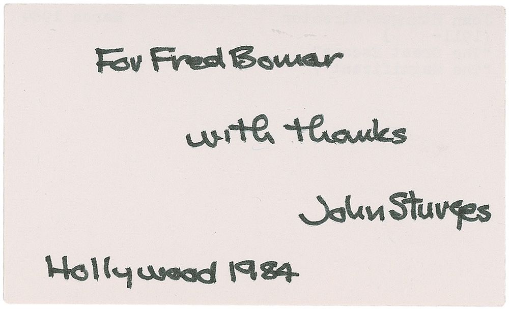 Noted film director (1910–1992) of such classics as Gunfight at the O.K. Corral, The Magnificent Seven, and The Great Escape. Felt tip signature and inscription, “For Fred Bomar, with thanks, John Sturges, Hollywood 1984,” on an off-white 5 x 3 card. In fine condition.
