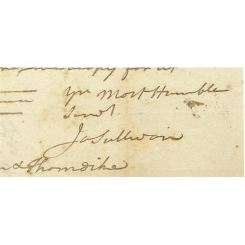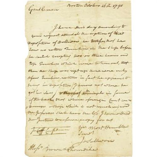 <B>John Sullivan Autograph Letter Signed, "</B></I><I>J. Sullivan".</B></I> One page, 6.5" x 8", Boston, October 16, 1790, to Brown and Thorndike in regards to a deposition, in part: "<I>He testifies that he saw no rotten Timbers in the ship before he sailed excepting two or three beams and Top Timbers which were taken out...he appears to bring his Deposition to the use of principle in some of the books that where a foreign Court condemns a ship which is not much injured the Insurers shall bear the loss...</B></I>" Sullivan (1740-1795), an American general in the revolution who served at Long Island (captured), Brandywine, Germantown as well as an infamous expedition against the Iroquois in 1779. Light folds and foxing, else fine. <I>Ex. Henry E. Luhrs Collection.</B></I><BR><BR><BR><b>Shipping:</b> Flat Material, Small (<a target="_blank" href="http://www.heritageauctions.com/common/shipping.php">view shipping information</a>)