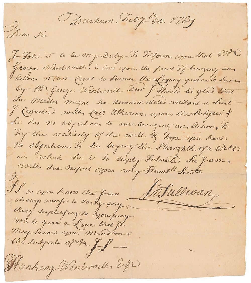 American general in the Revolutionary War and a delegate in the Continental Congress. Sullivan served as a major general in the Continental Army and as governor (or president) of New Hampshire. He is most famous for leading the Sullivan Expedition in 1779, a scorched earth campaign against the Iroquois towns that had taken up arms against the American revolutionaries. ALS signed “Jno Sullivan,” one page, 7 x 8, February 6, 1796. Letter to Hunking Wentworth. In part: “Mr. George Wentworth is now upon the point of bringing an action at Next Court to Recover the Legacy given to him by Mr. George Wentworth Decd. I should be glad that the matter might be accommodated without a suit. I conversed with Col. Atkinson upon the Subject and he has no objection to our bringing an action to try the validity of the will & hope you have no Objection to trying the strength of a will in which he is so deeply interested.” In very good condition, with intersecting folds, trimmed left edge, and scattered toning.