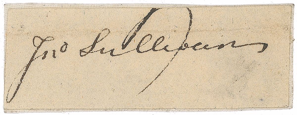 American general in the Revolutionary War and a delegate in the Continental Congress (1740–1795) who served as governor of New Hampshire and commanded the Sullivan Expedition in 1779. Ink signature, “Jno. Sullivan,” on an off-white 2 x .75 slip affixed to a same-size mount. A light horizontal fold (passing through the top of the surname), a closely cropped top edge, and trivial soiling, otherwise fine condition.